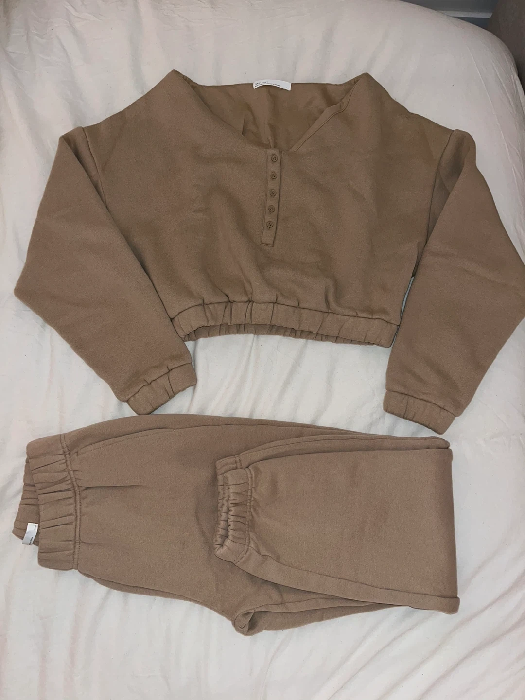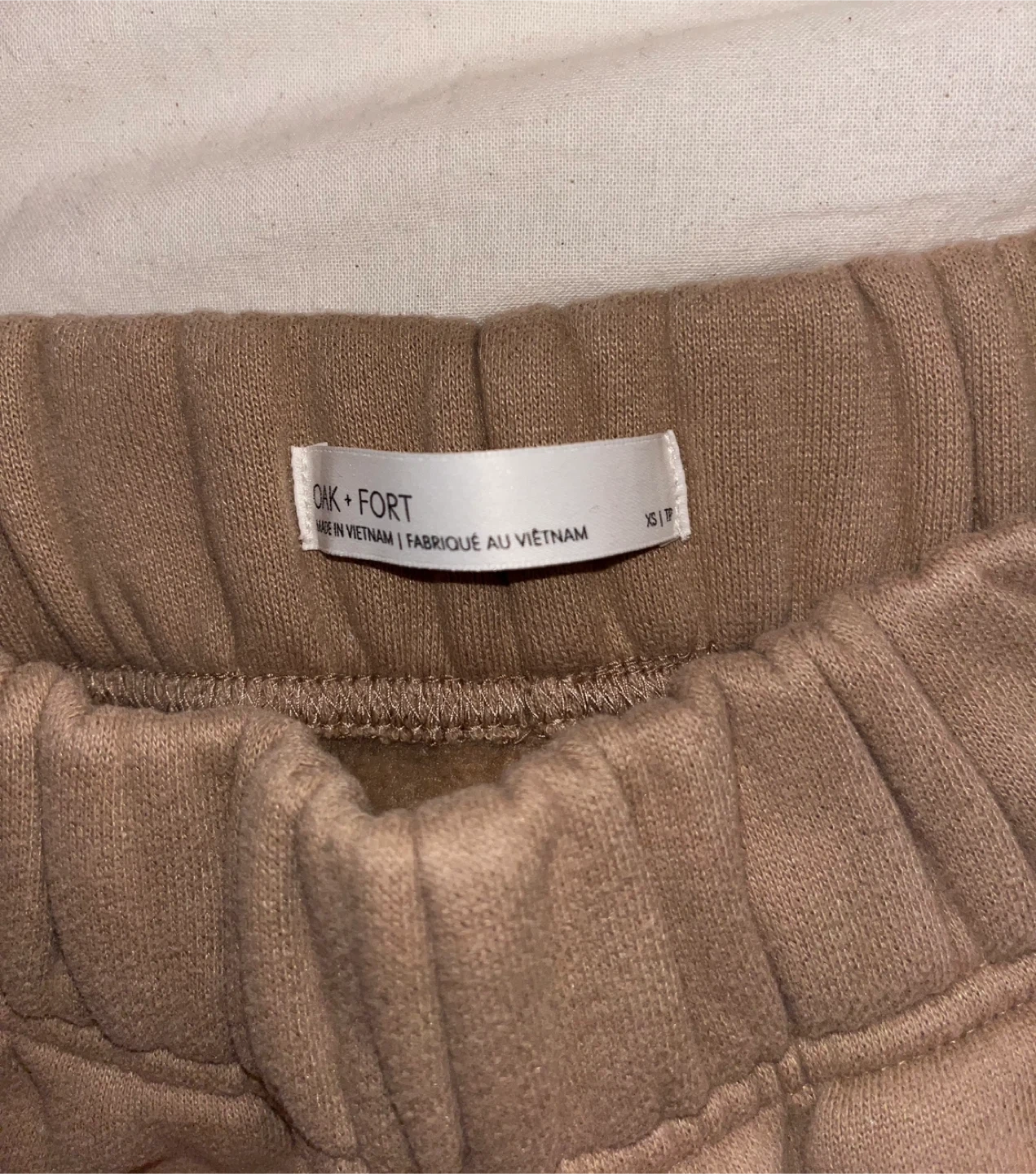 Selling a comfy Oak + Fort loungewear set. It's a beautiful beige colour with a size Small cropped sweater and Extra Small joggers. Perfect for relaxing at home or running errands!