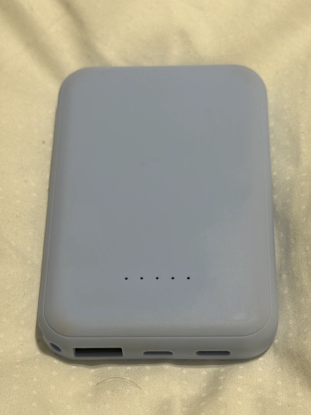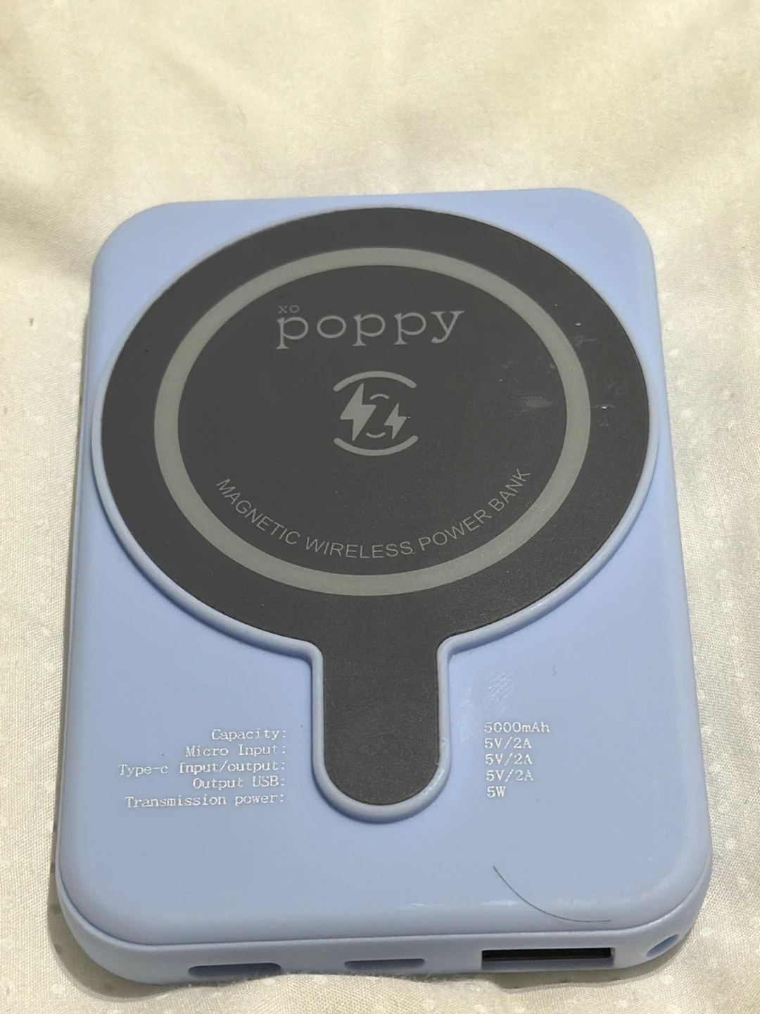Selling a Poppy magnetic wireless power bank. It has a 5000mAh capacity and a micro input. It also has Type-C input/output and a USB output. Transmission power is 5W. Great for on the go charging!