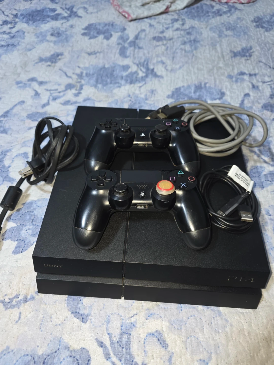Selling a used PlayStation 4 with two controllers. Comes with all the necessary cables to get you gaming right away!