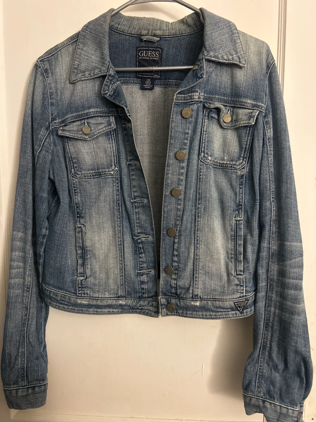Selling a Guess denim jacket in size Large! It's a classic light wash denim with button closures and pockets. Perfect for layering or wearing on its own. The material is durable and comfortable.