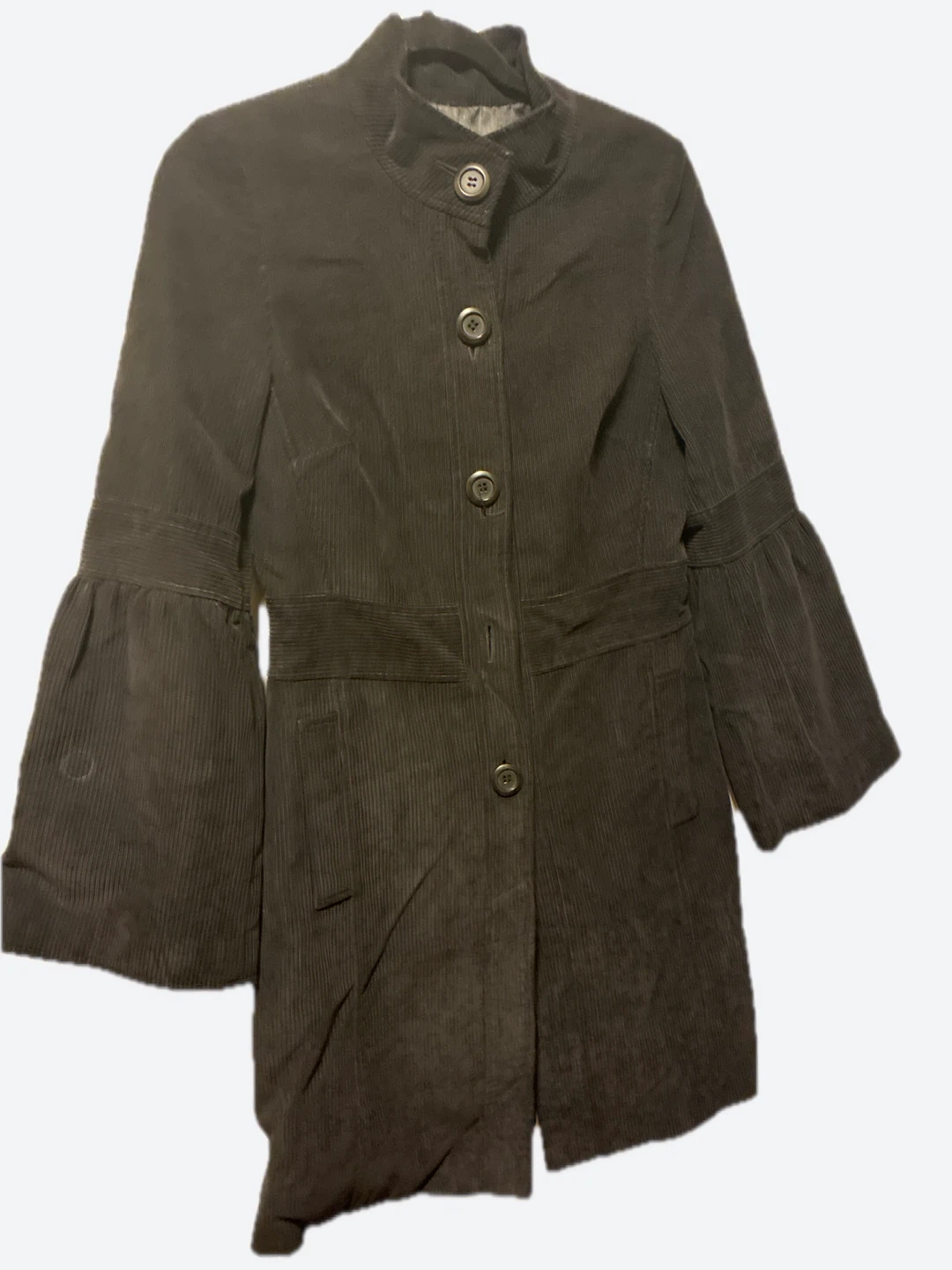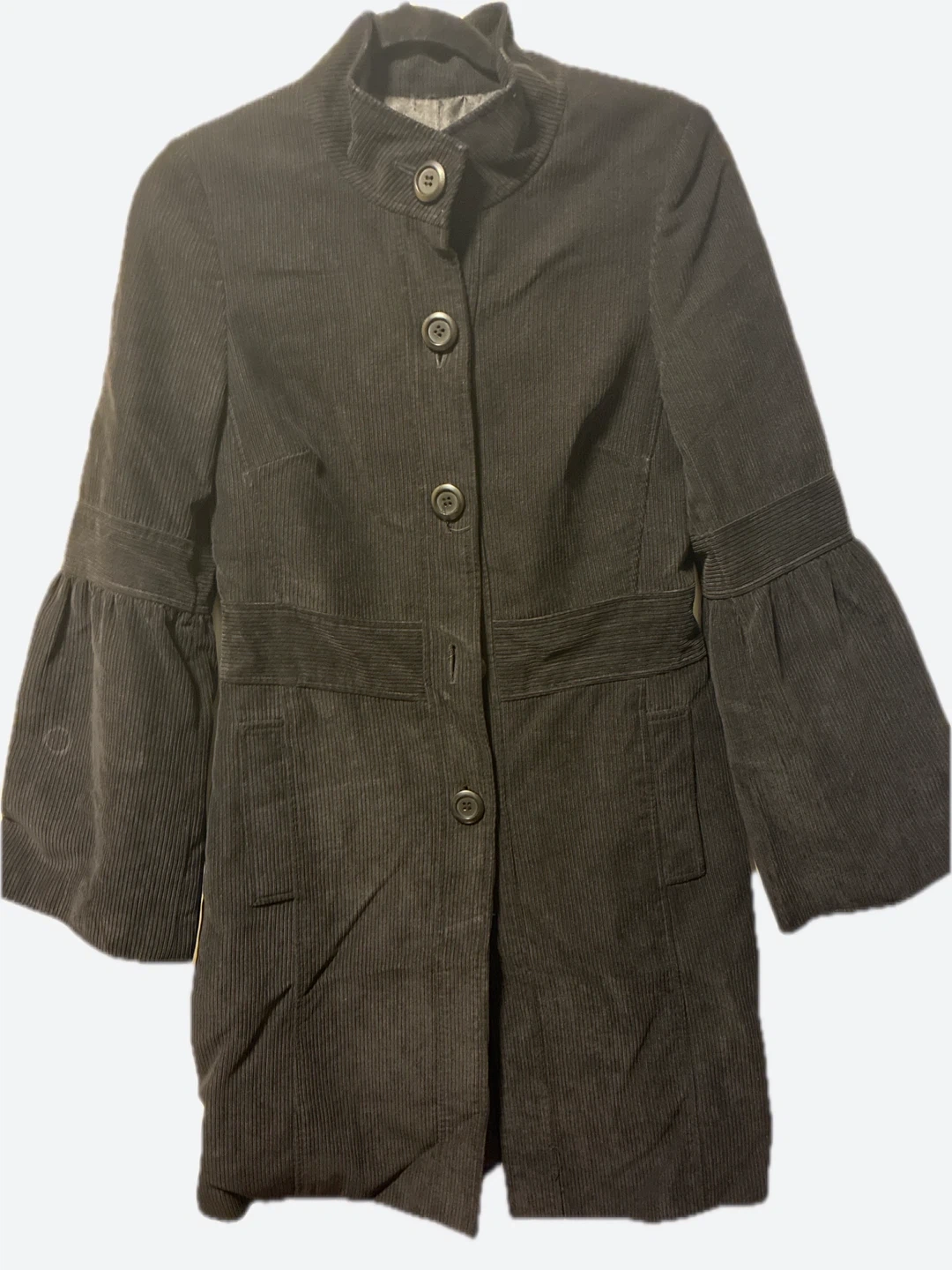 Here's a stylish black corduroy jacket! It's in great condition and ready for a new wardrobe. The jacket features a unique design with flared sleeves and a button-up front. It's perfect for adding a touch of vintage charm to any outfit