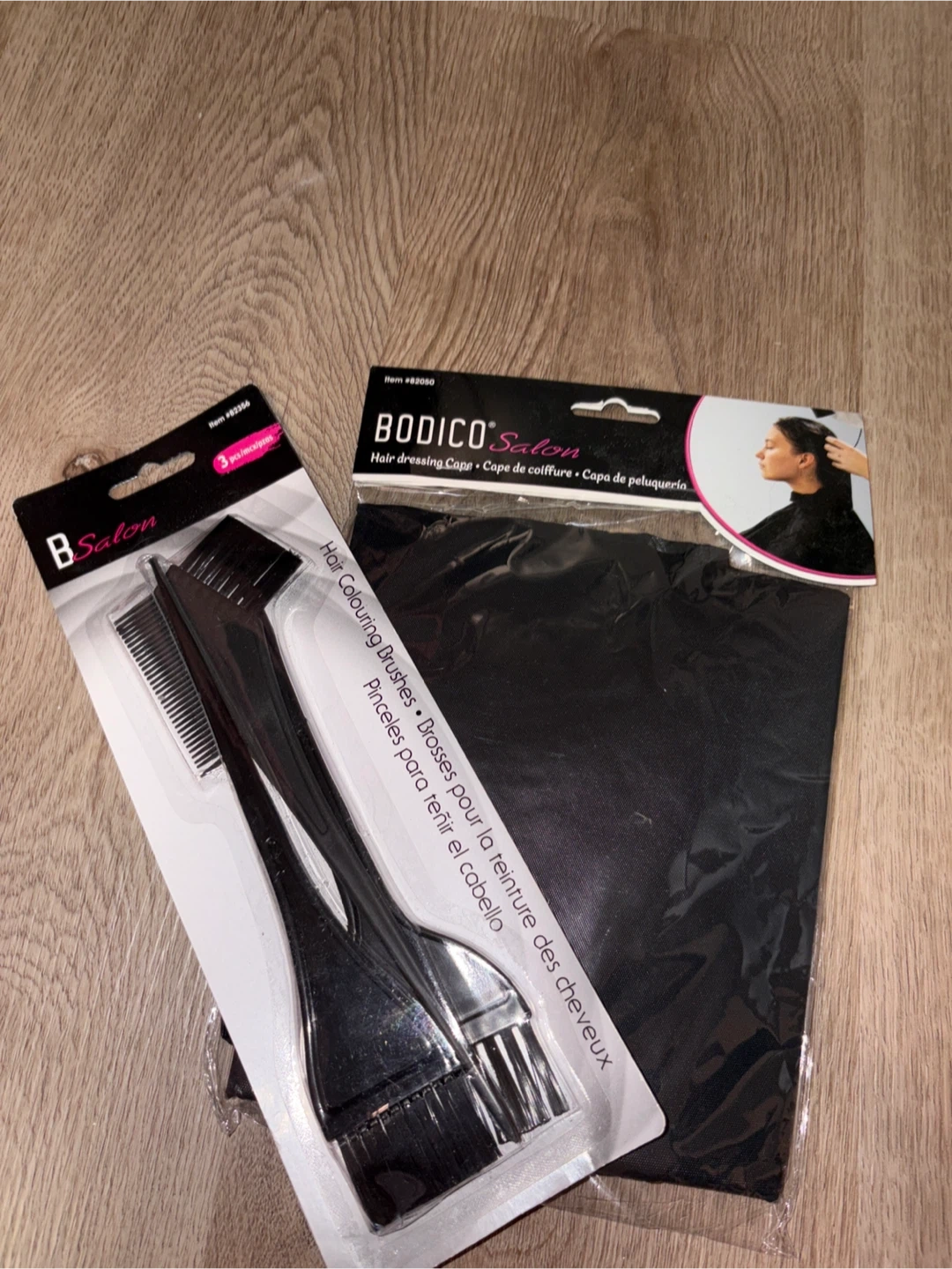 I'm selling a set of hair colouring tools! This includes B Salon hair colouring brushes (3 pieces) and a BODICO Salon hair dressing cape. Perfect for at-home hair dyeing!