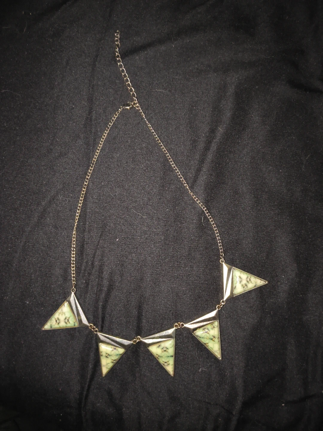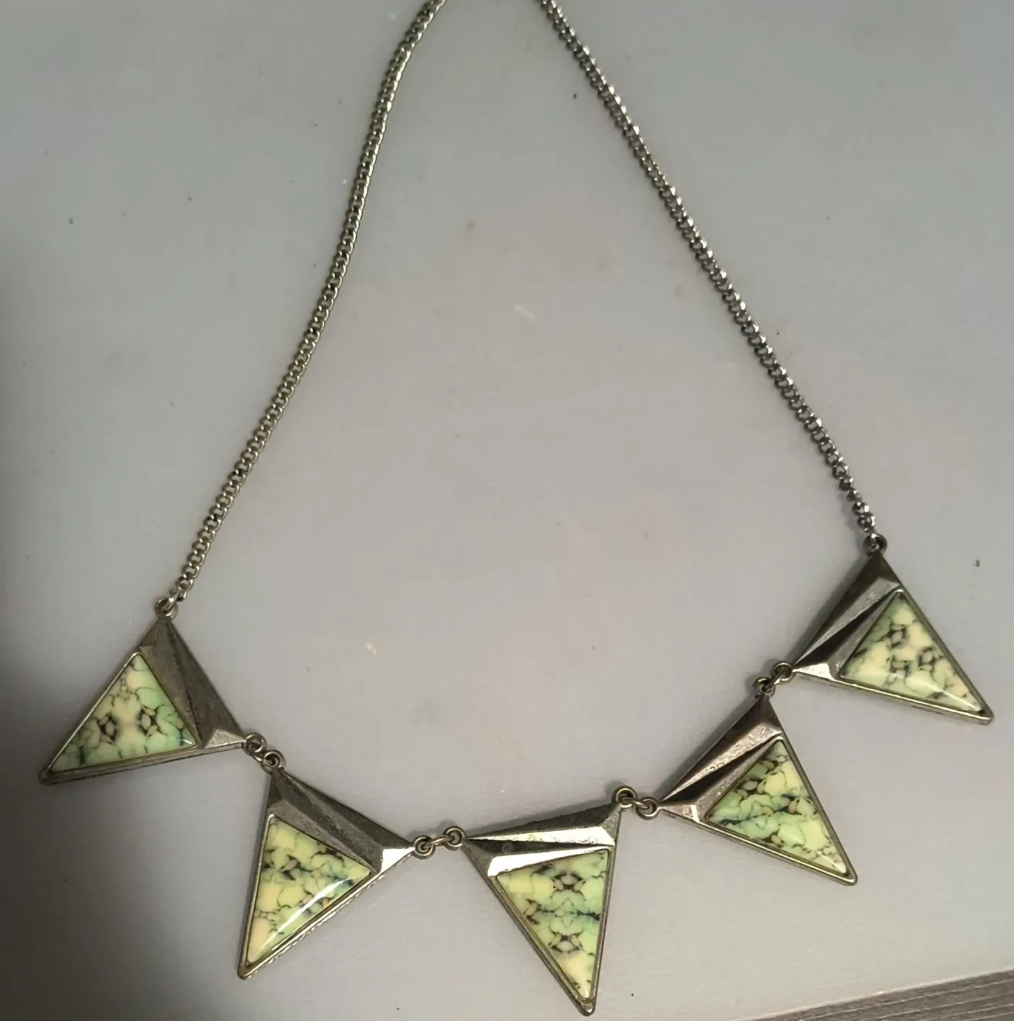 This is a statement necklace featuring triangle pendants. The pendants have a light green and black marbled pattern with a silver-tone metal frame. It's a fun piece to add a bit of interest to any outfit!
