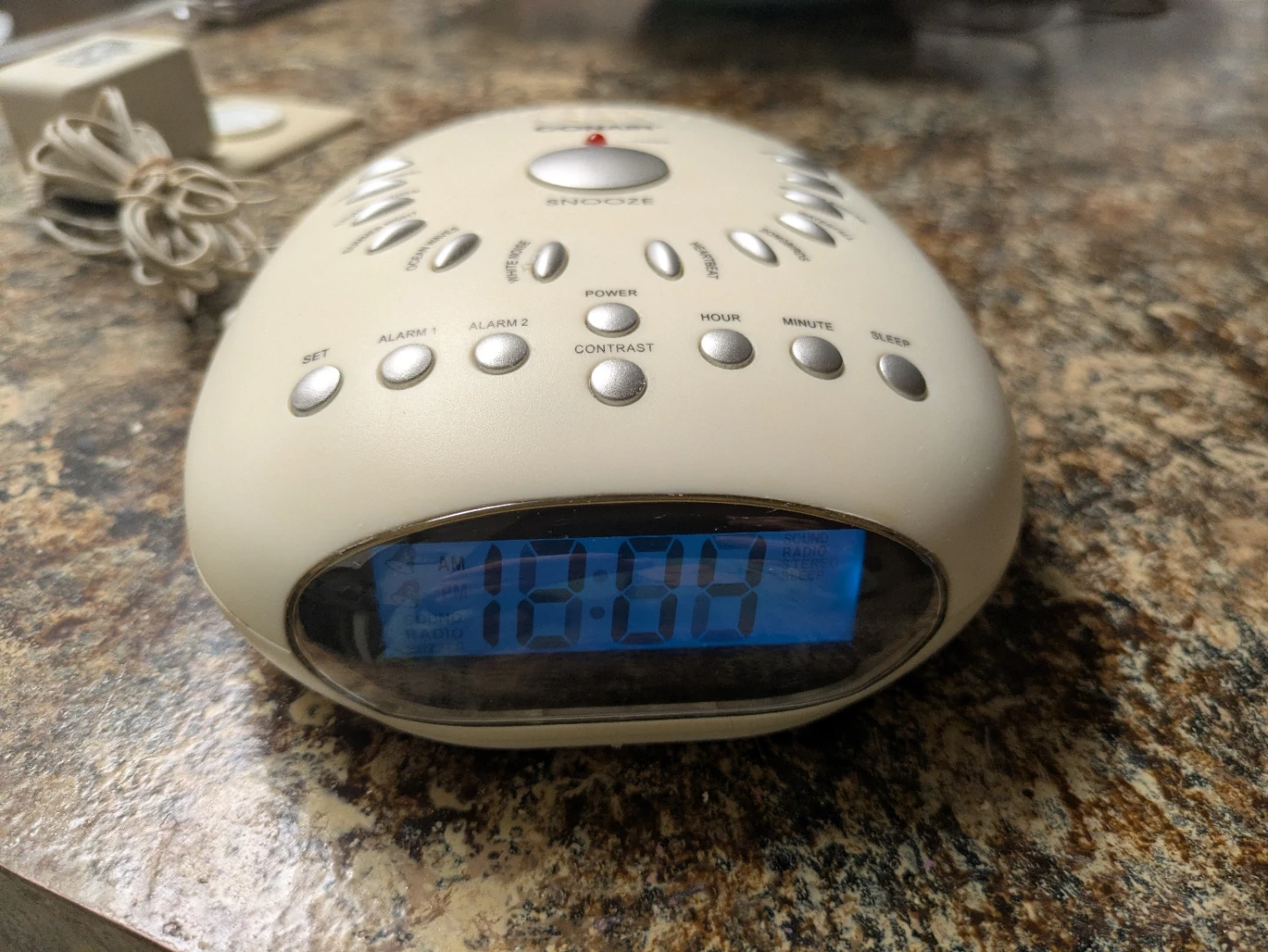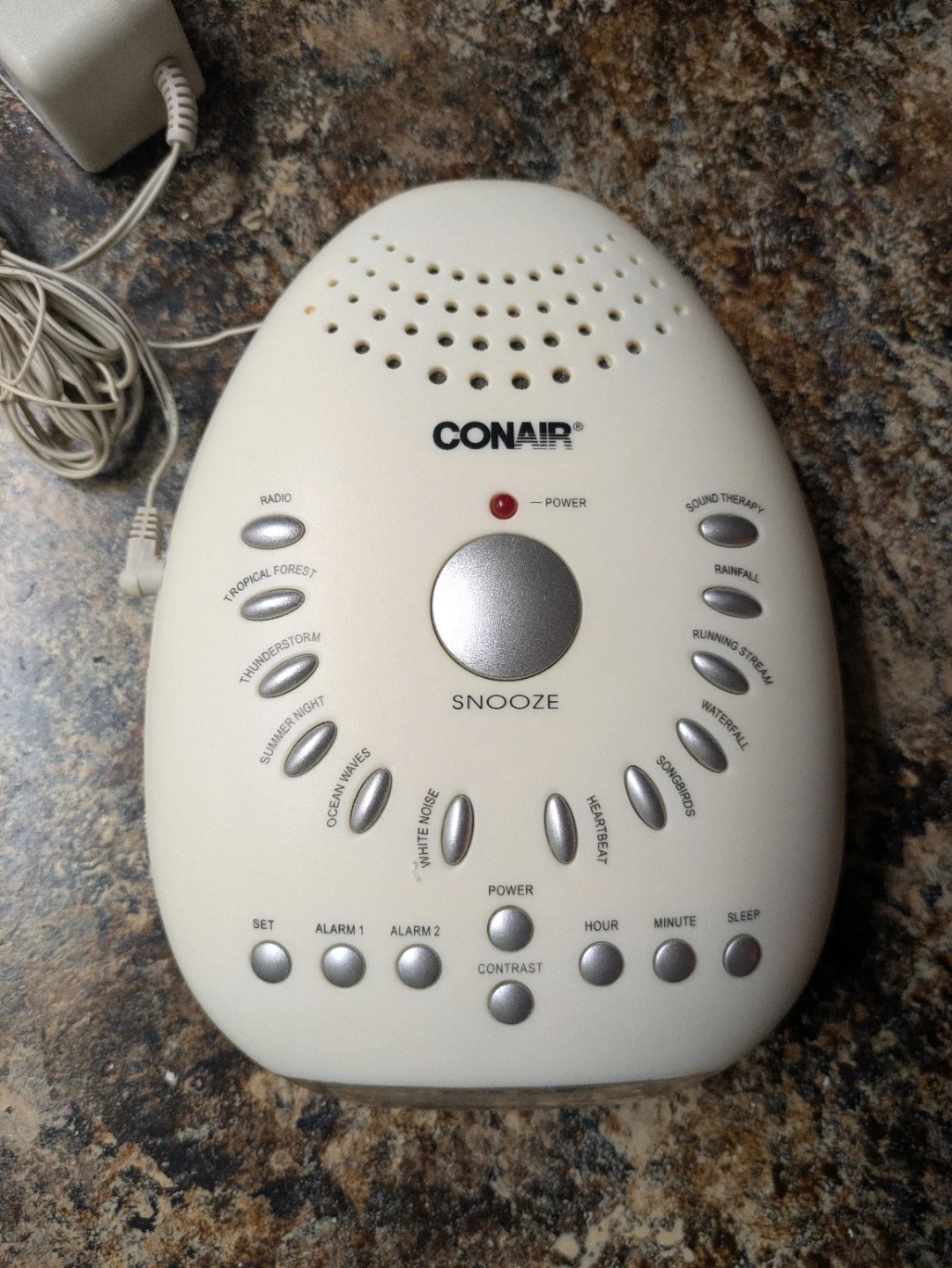 Selling a Conair sound therapy alarm clock! It has a bunch of different sound options to help you relax and fall asleep, like rainforest, waterfall, and heartbeat. It also functions as a regular alarm clock with a digital display. Model number SU7C.