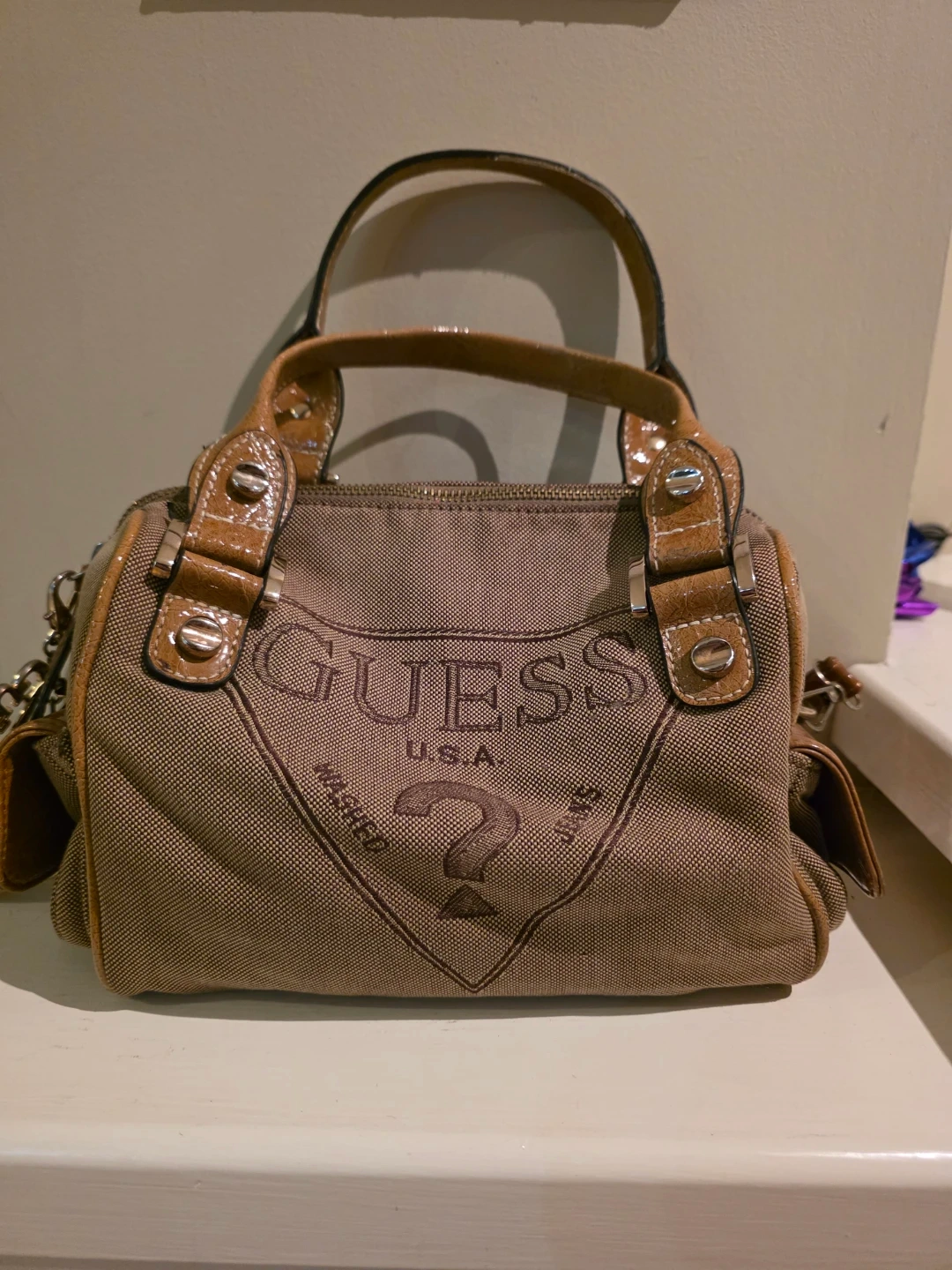 Here's a Guess handbag with a unique washed design! It features a brown colour with leather-look accents. This bag is perfect for adding a touch of vintage charm to your outfit