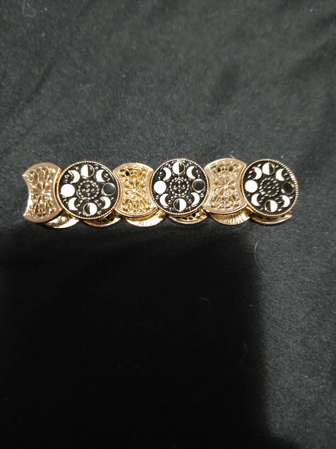Selling a vintage gold tone bracelet featuring a moon phase design. It's in great condition and would be a stylish addition to any outfit! The bracelet has a unique and eye-catching design.