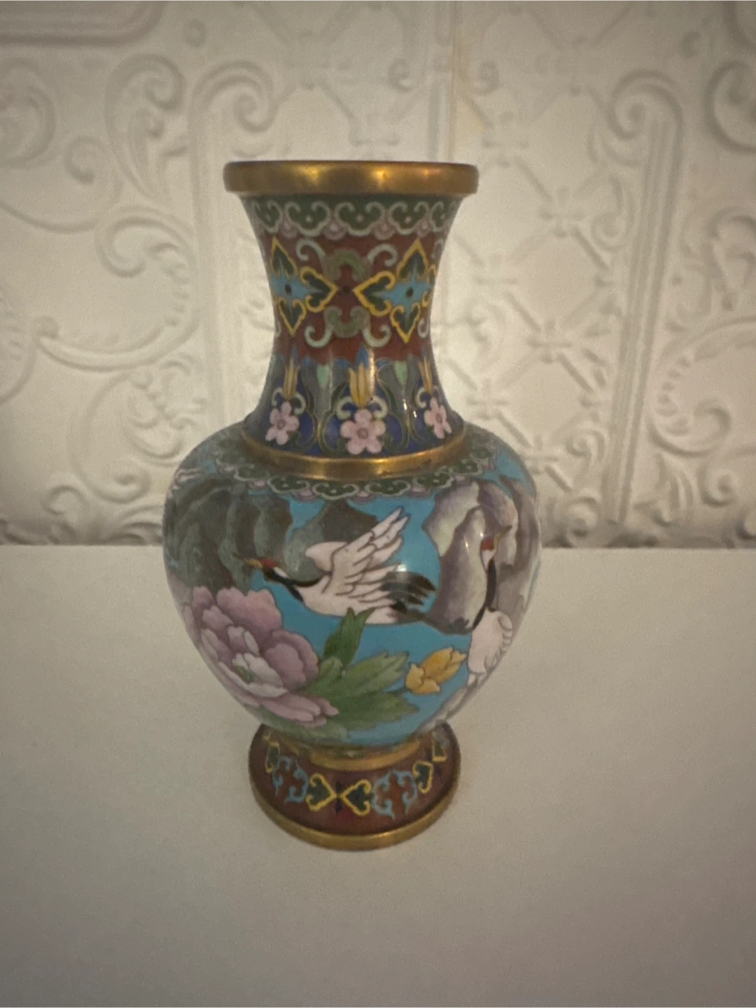 This is a beautiful cloisonné vase featuring a delicate crane and floral design. It would make a lovely addition to any home decor collection. The vase is in great condition and ready to be displayed