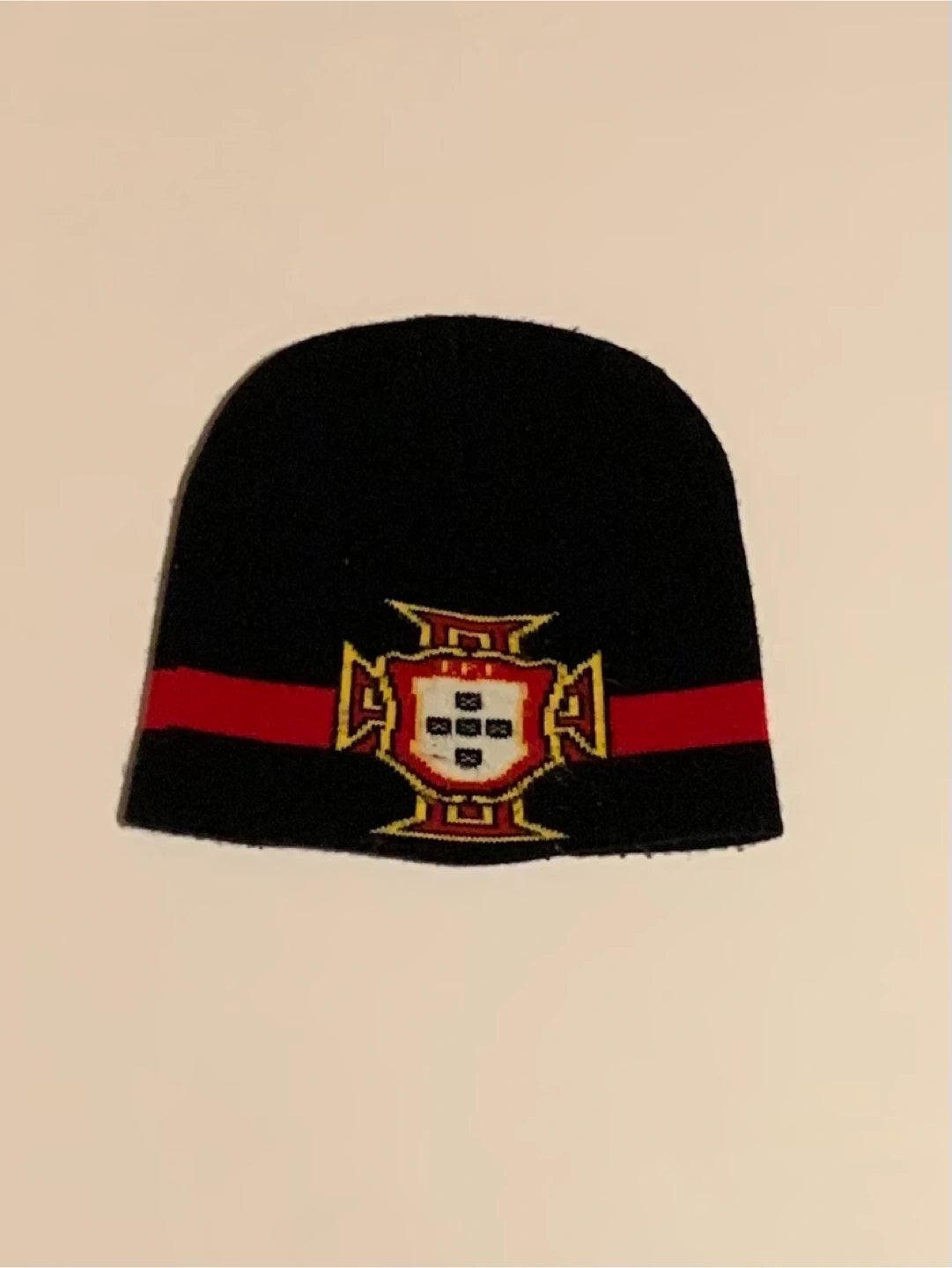 Selling a black beanie featuring a red stripe and the emblem of Portugal. It's in great condition and perfect for showing your support or adding a unique touch to your winter wardrobe