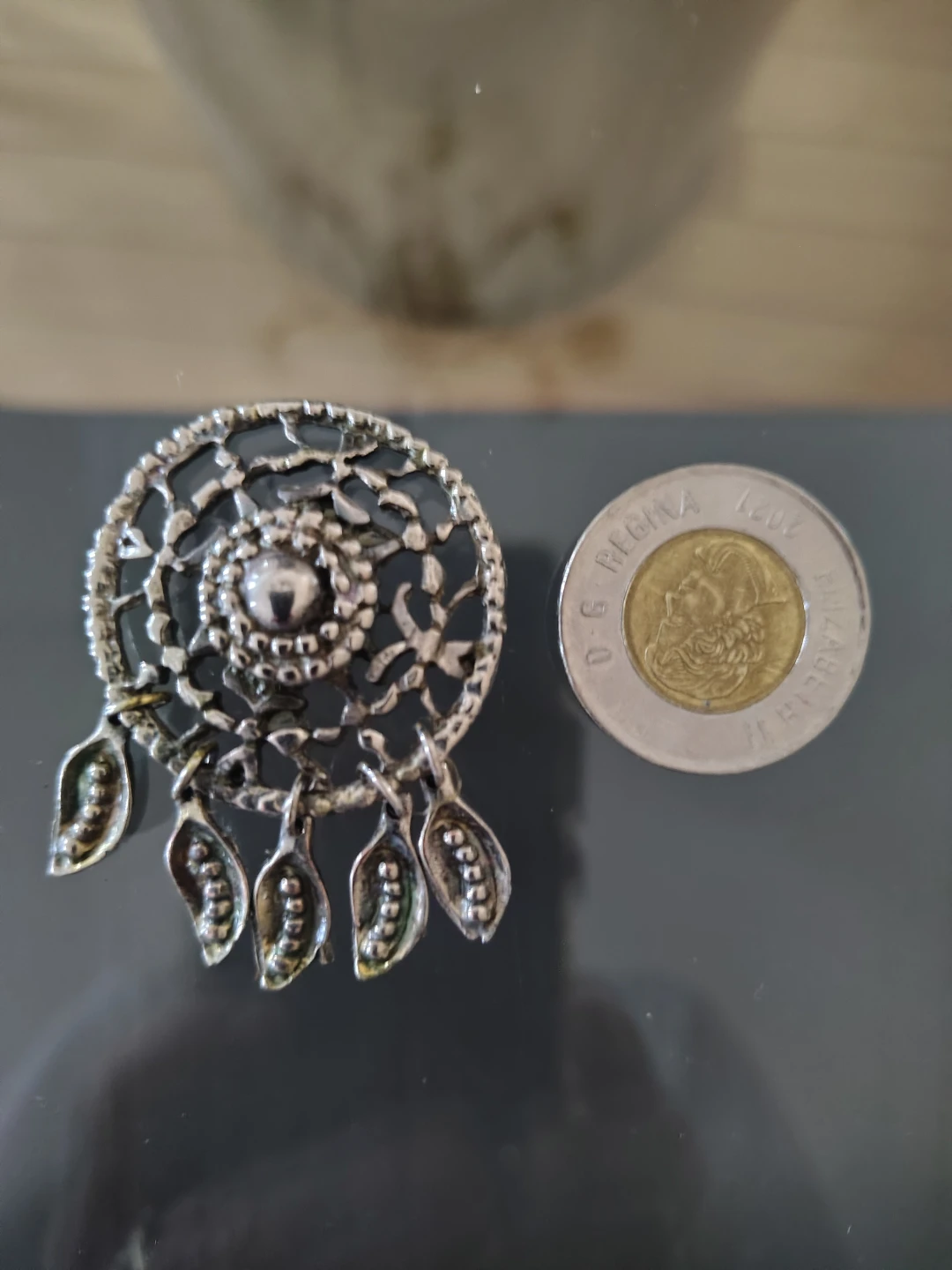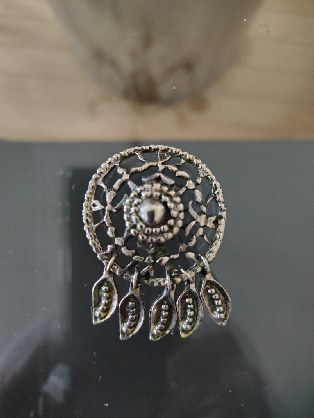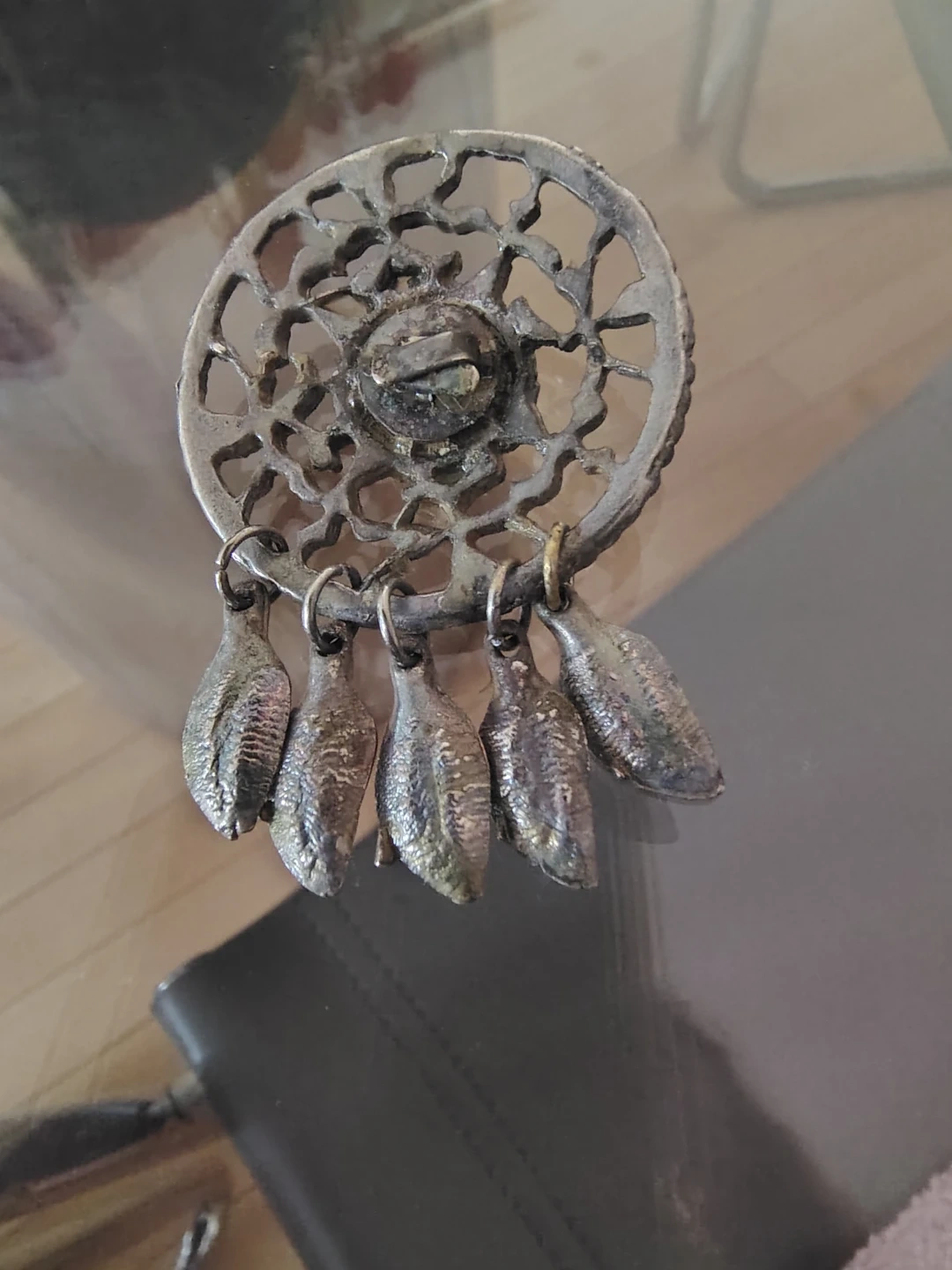 The front features a detailed dream catcher motif. On the back is an unusual metal attachment — possibly designed to clip onto a belt, garment, or strap, or it may function as a type of fastener, button, or decorative closure. Despite research, the exact intended use remains unclear, which adds to its mystery and appeal.
