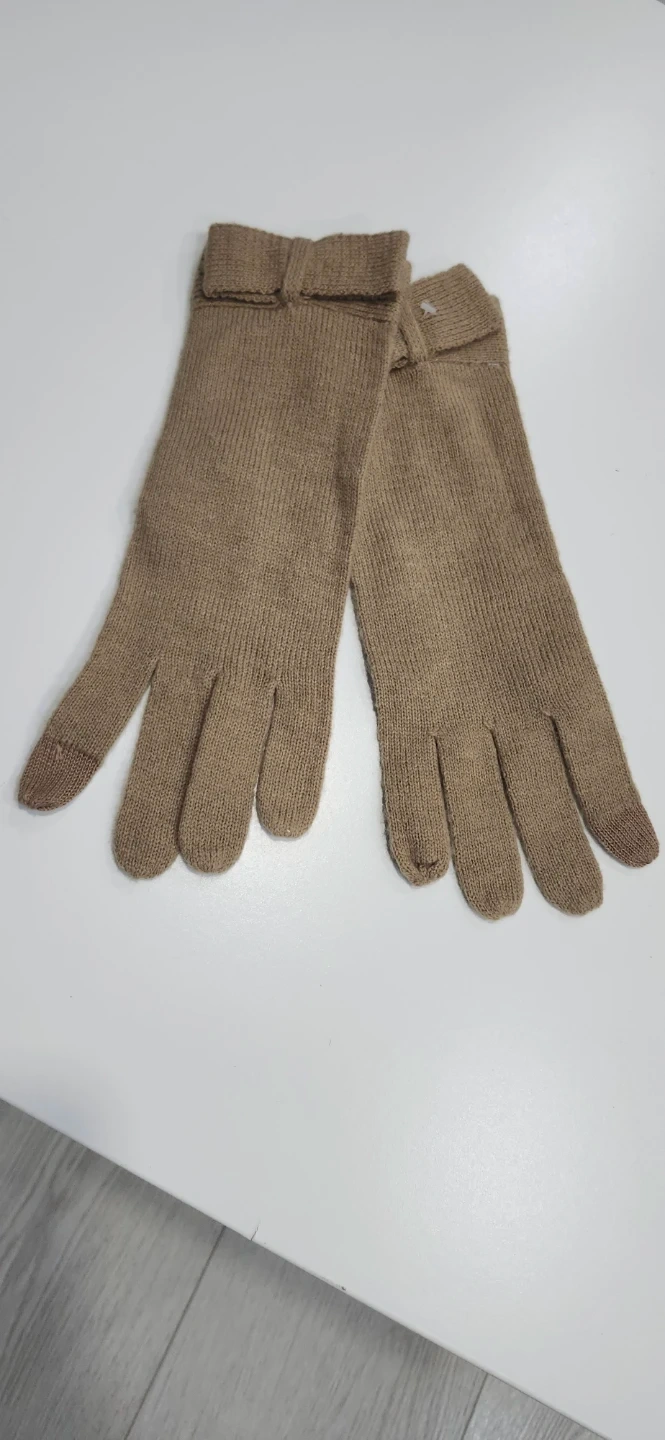 Selling a pair of beige knit gloves. They have a cute bow detail on the cuff. Perfect for keeping your hands warm this fall and winter!