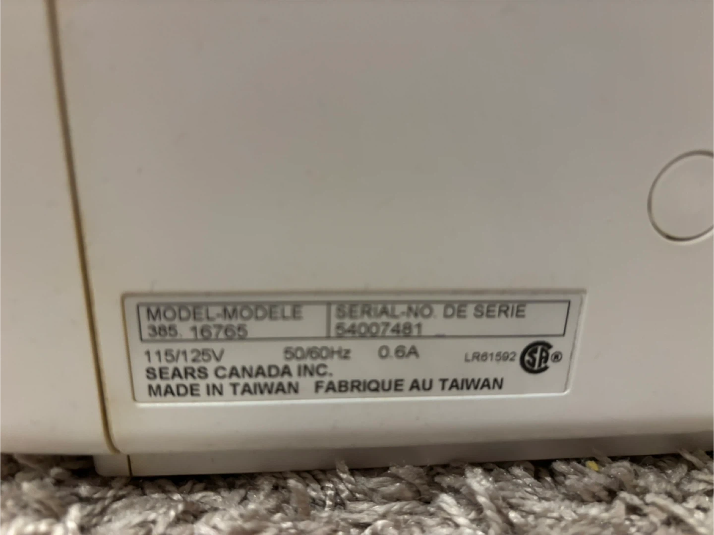 Selling a Kenmore sewing machine, model 385.16765. It's a Limited Edition model. Made in Taiwan by Sears Canada Inc.