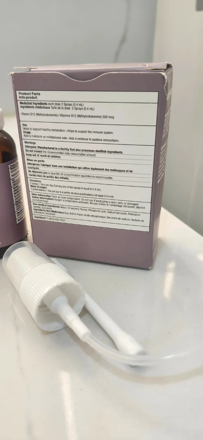 - Medicinal ingredient: Vitamin B12 (Methylcobalamin) 500 mcg per dose (0.4 mL)