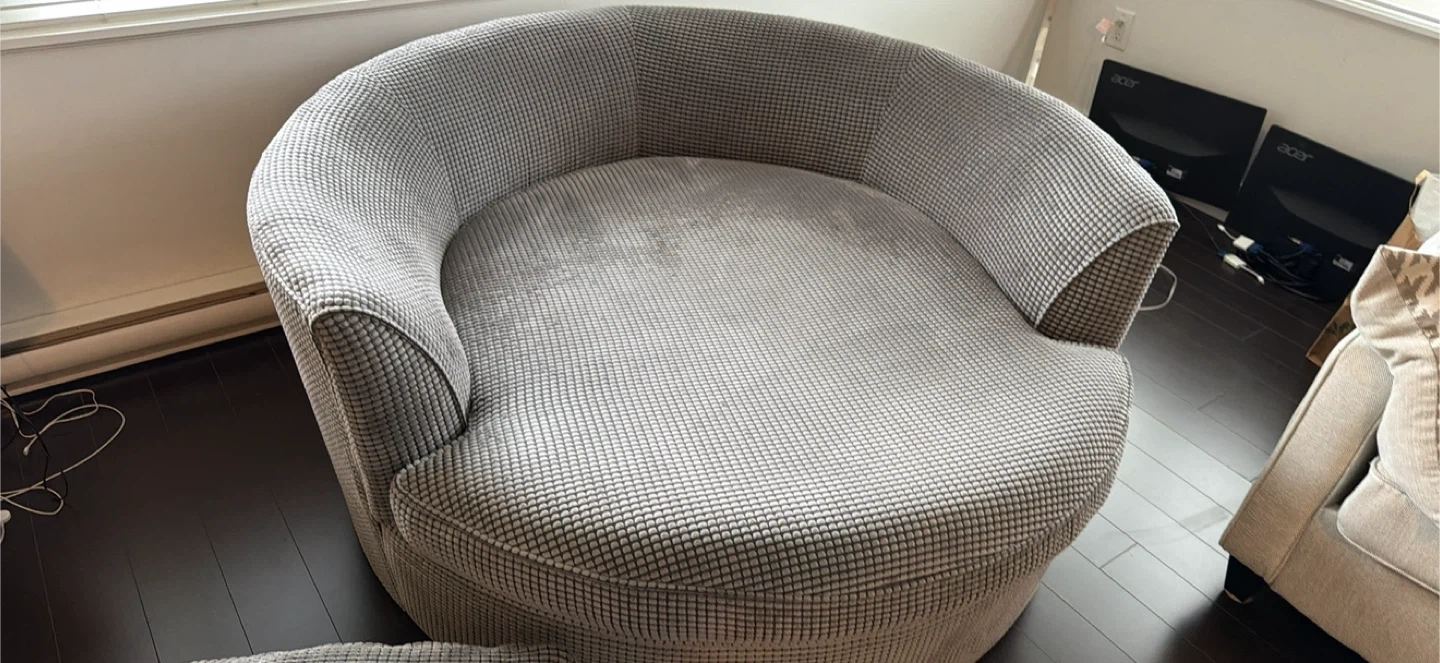 Here's a comfy oversized round sofa that would be a great addition to any room! It comes with several matching pillows for extra comfort. The sofa is in good condition and ready for a new home. Perfect for relaxing and unwinding after a long day. Measurements From edge to edge Width 4.5 ft *