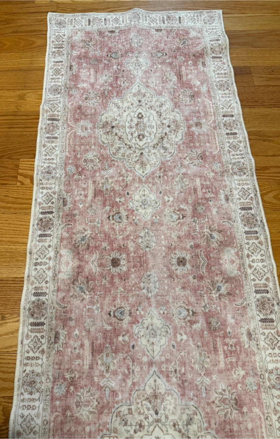 Here's a lovely pink runner rug! It measures 2 feet by 6 feet. Perfect for adding a touch of warmth and style to any hallway or kitchen