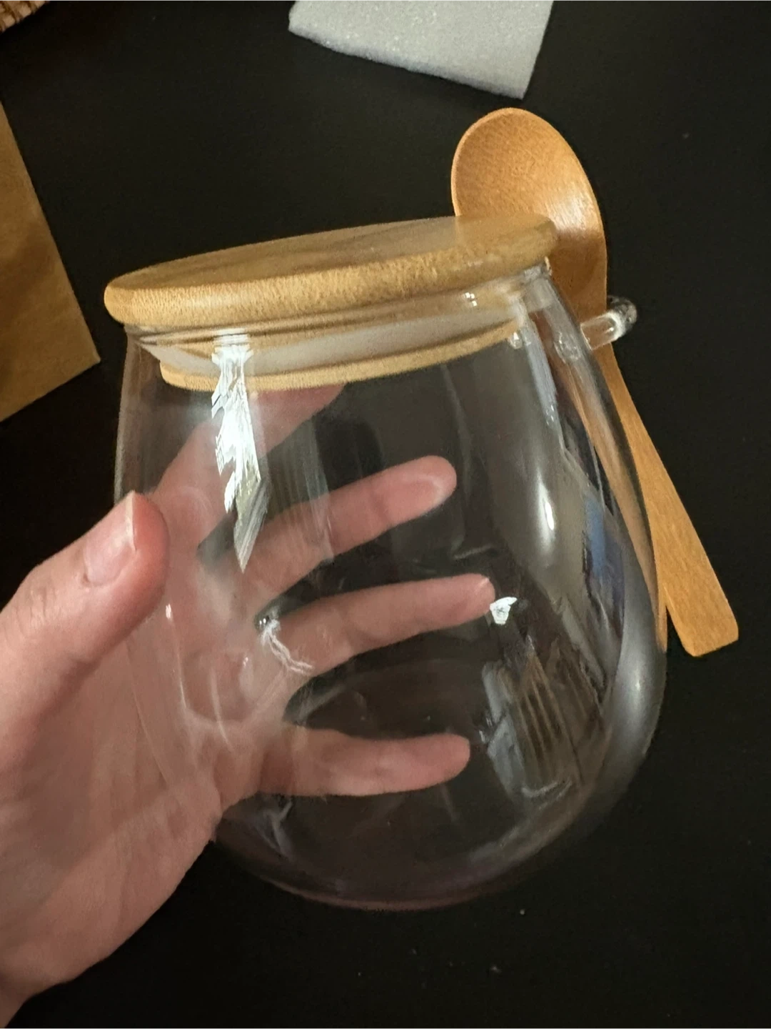 Selling a cute glass jar that comes with a wooden lid and a wooden spoon! It's perfect for storing anything from spices to snacks, and the clear glass lets you easily see what's inside. A stylish and functional addition to any kitchen or pantry