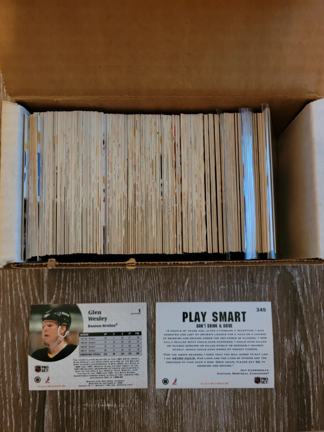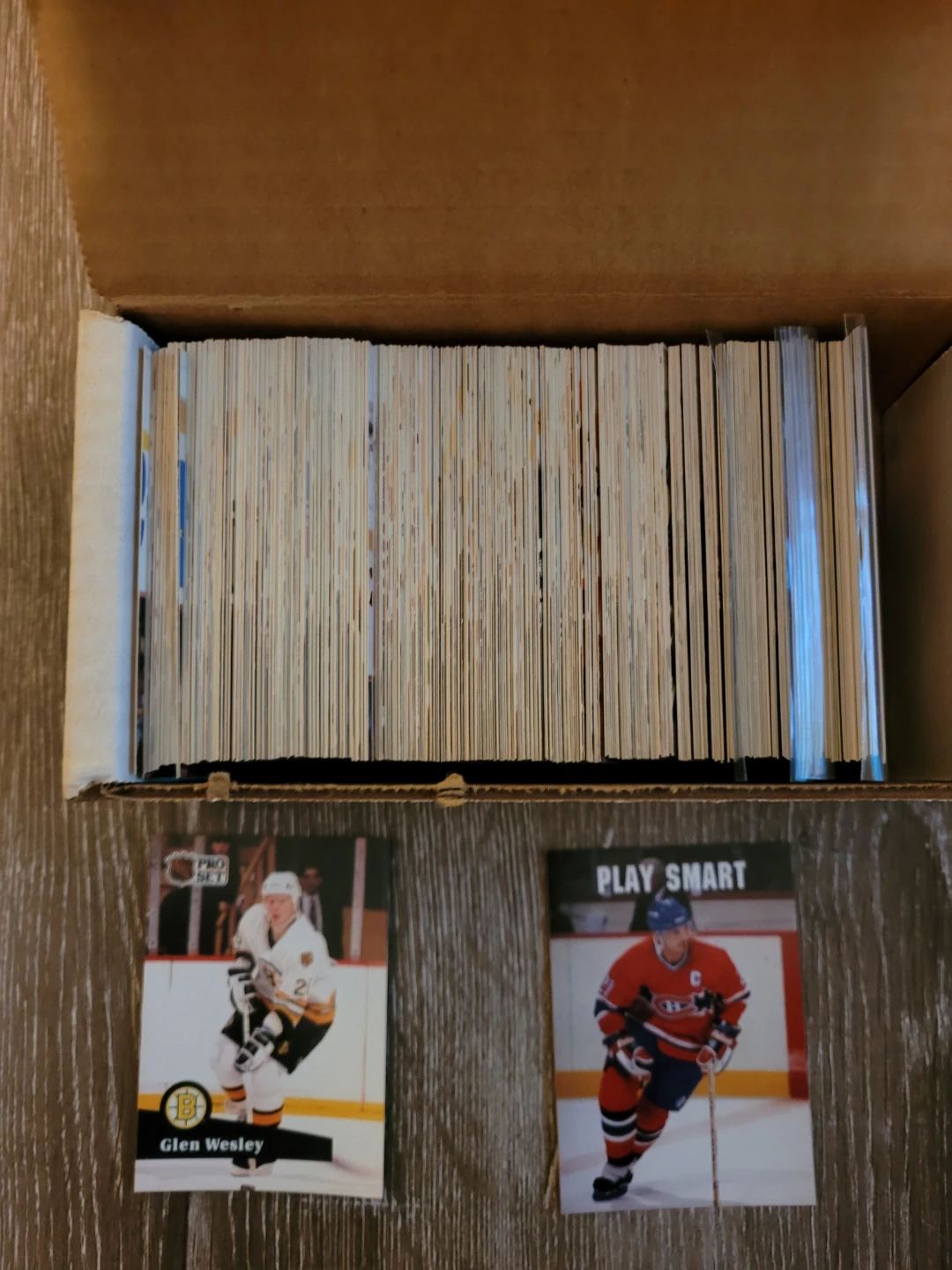 I have a box of hockey trading cards available. There are a lot of cards in the box, ready for a new collector to sort through