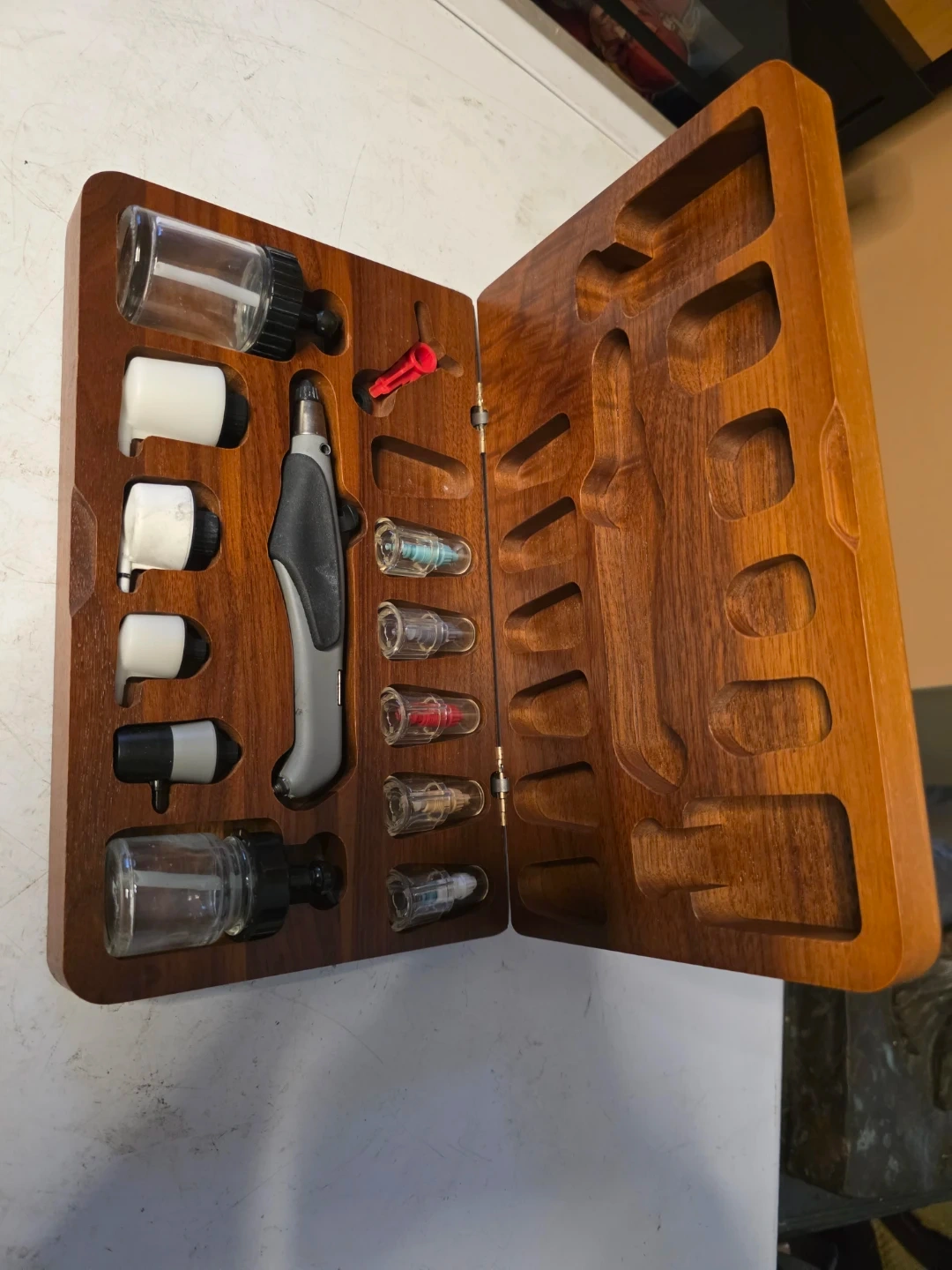 It is a complete airbrush system housed in a wooden storage case.