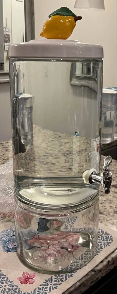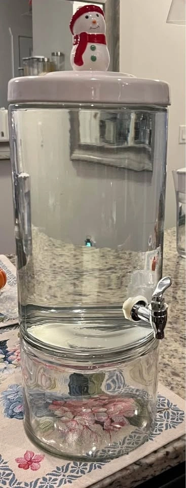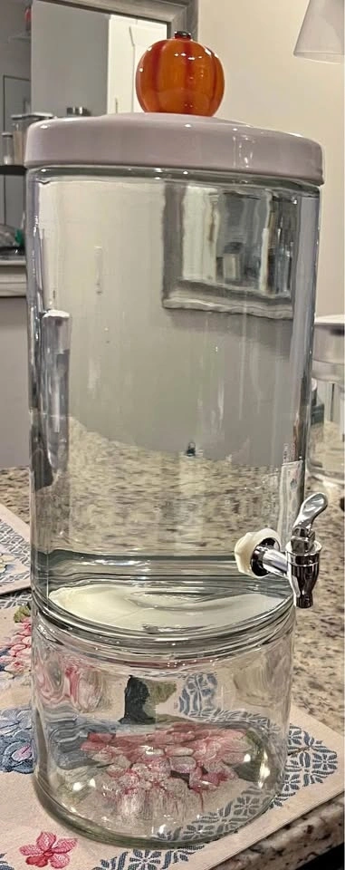 Glass Drink Dispenser w/ fun Decoration ( 🎃 Santa, & 🍋 Lemon ) Dimensions: from lid to bottom 17”/52cm or from Deco to bottom 22.5”/43.5cm | 7”/18cm wide.