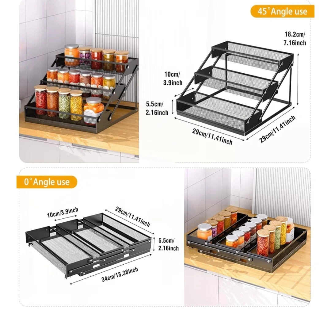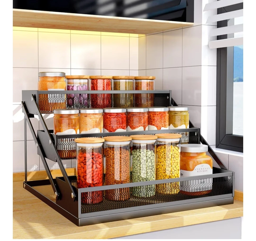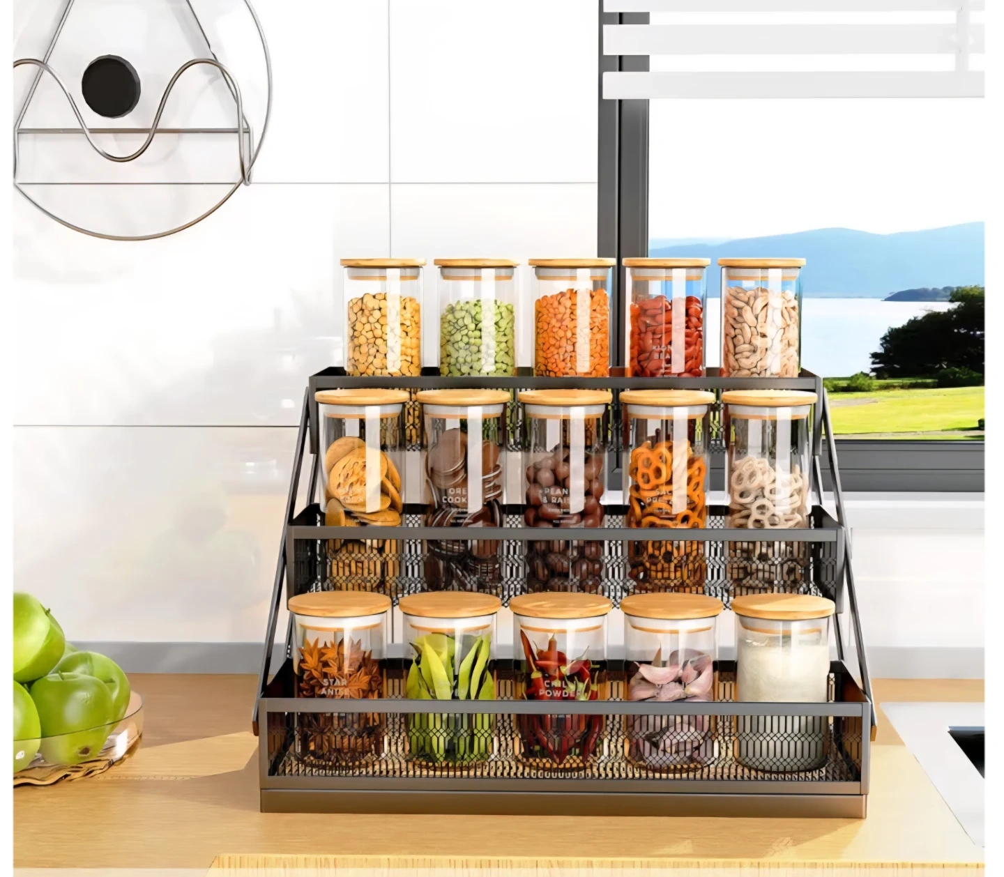 Declutter your kitchen with this handy 3-tier expandable spice rack organizer! It's perfect for keeping your spices, jars, and other kitchen essentials neatly organized and easily accessible.