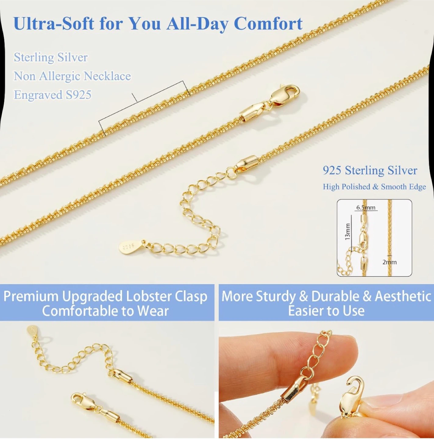 This is a beautiful S925 sterling silver necklace plated with 14K gold. It's designed to be ultra-soft and comfortable for all-day wear. The necklace is non-allergenic and features an engraved S925 mark. It also has a premium upgraded lobster clasp that's comfortable to wear and more sturdy and durable