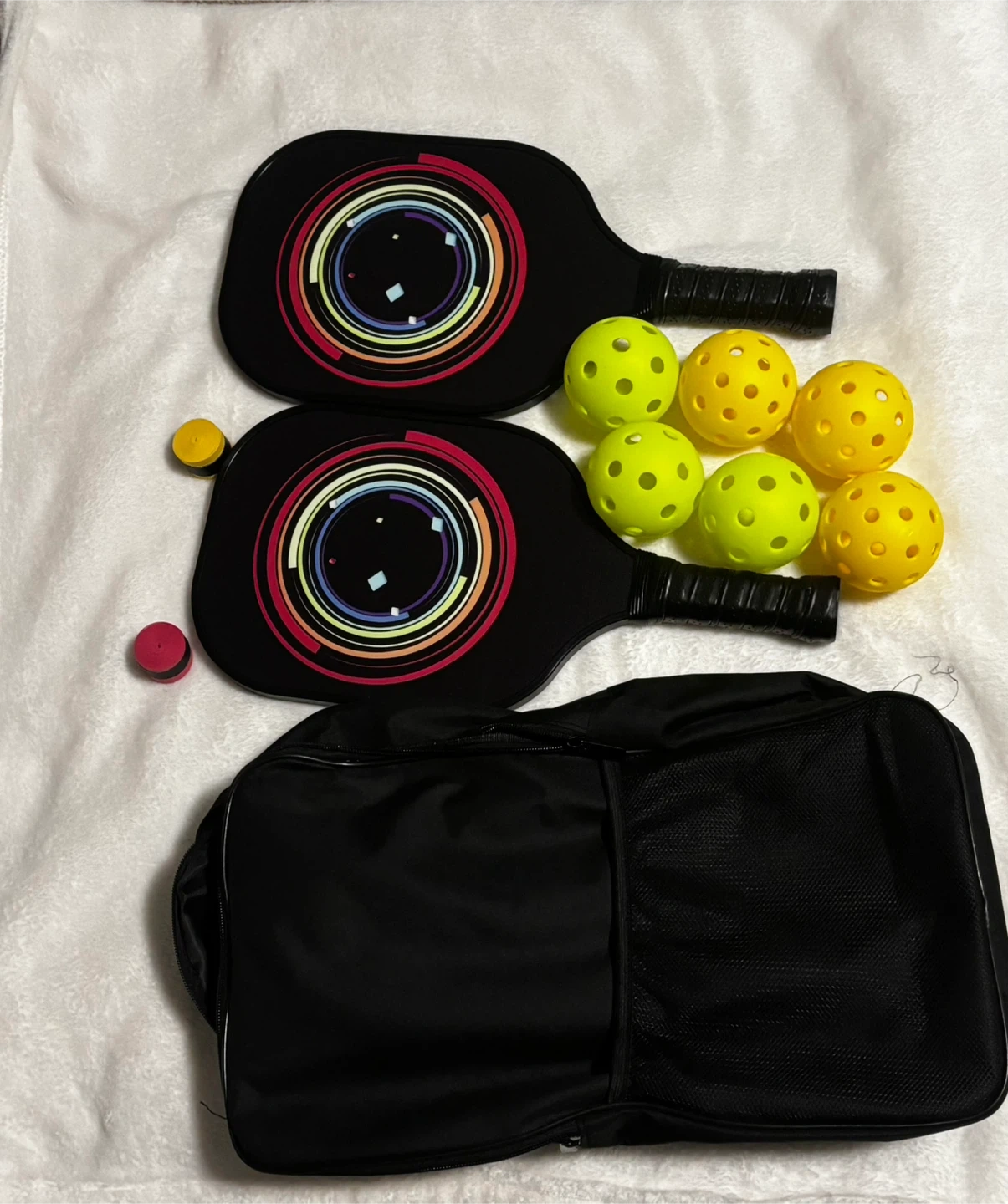 Get ready to hit the court with this pickleball set! Includes two paddles with a cool design, several pickleballs in yellow and green, and a handy black carrying bag to keep everything organized. Perfect for some fun in the sun! Negotiable price