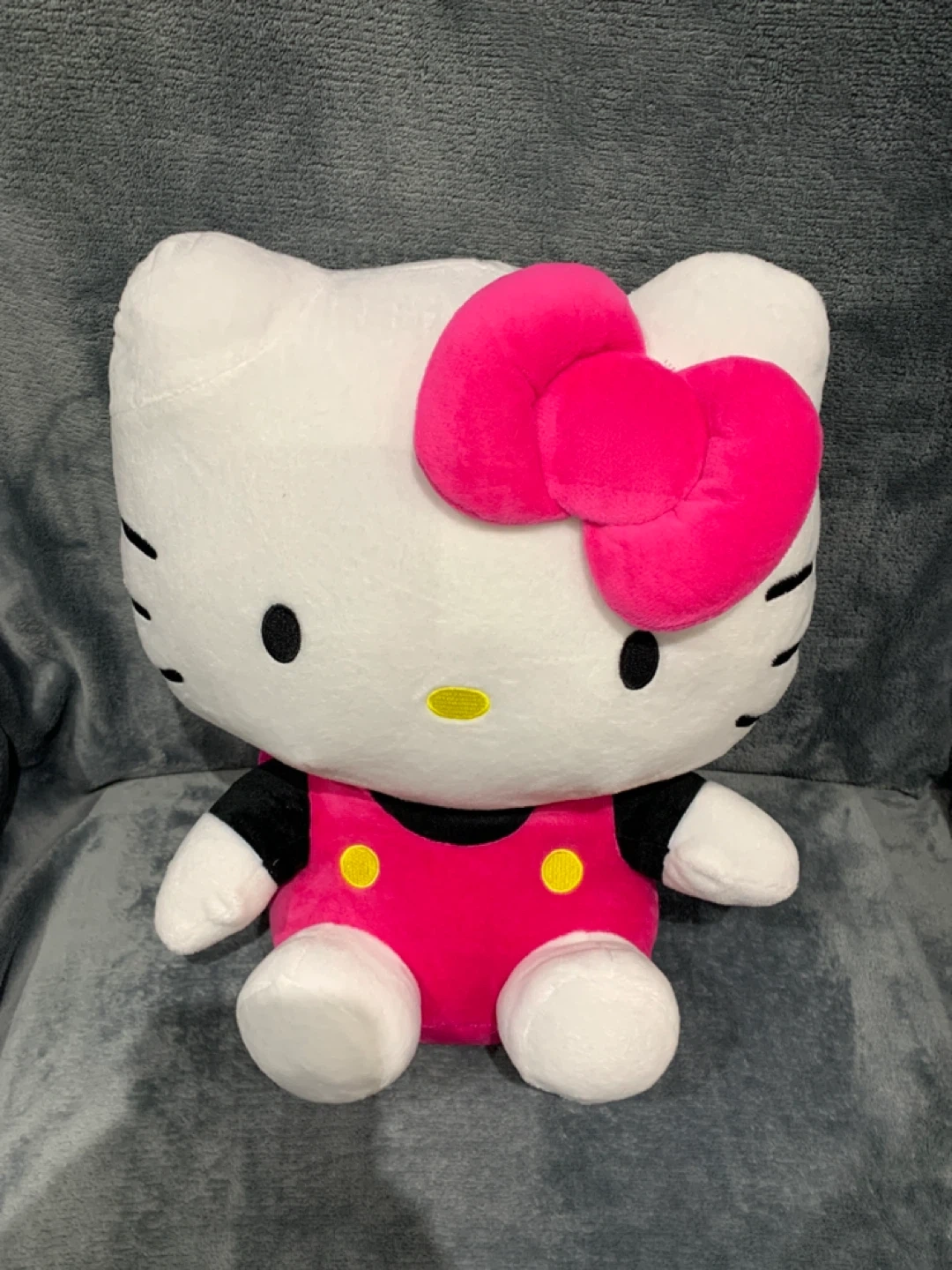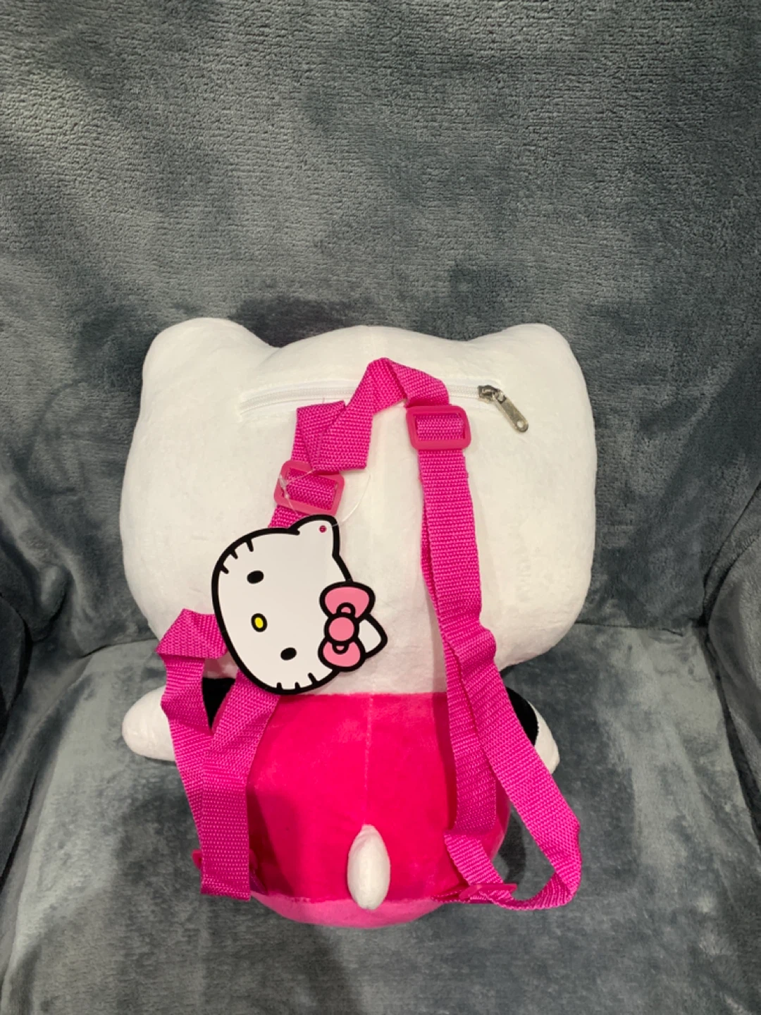 Super cute Hello Kitty plush backpack! It's white with a pink bow and straps. Perfect for carrying small items or just for fun