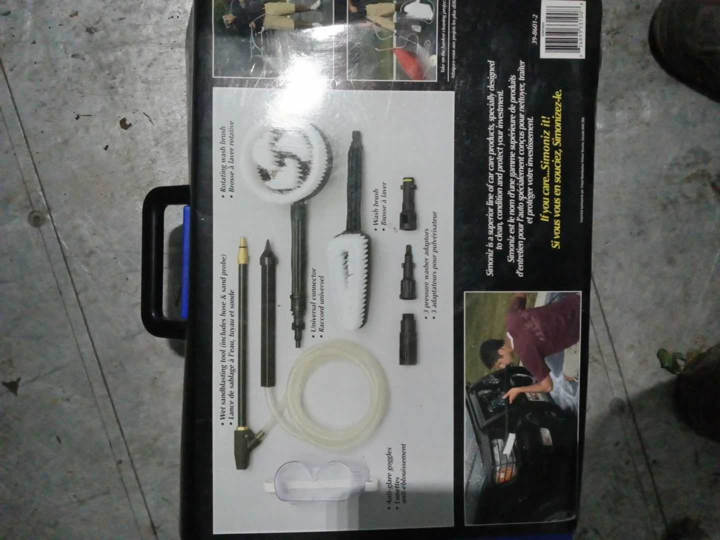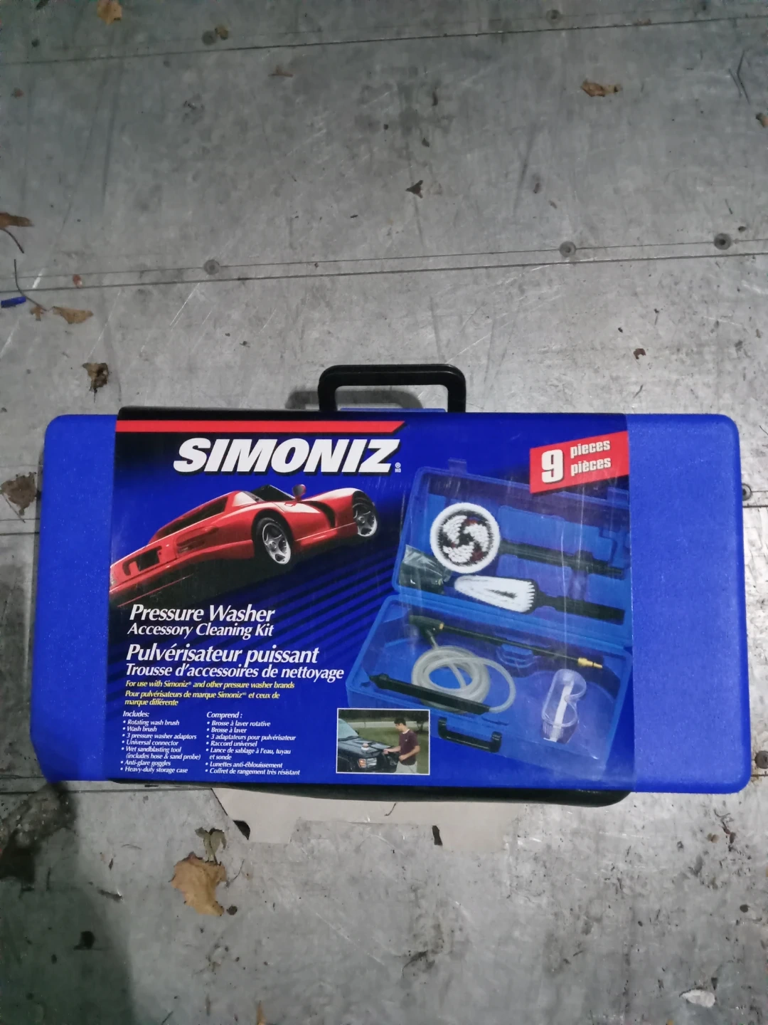 Selling a Simoniz pressure washer accessory cleaning kit. It includes a rotating wash brush, wash brush, wet sandblasting tool, universal connector, 3 pressure washer adapters, and safety goggles. The kit also comes with a heavy-duty storage case.