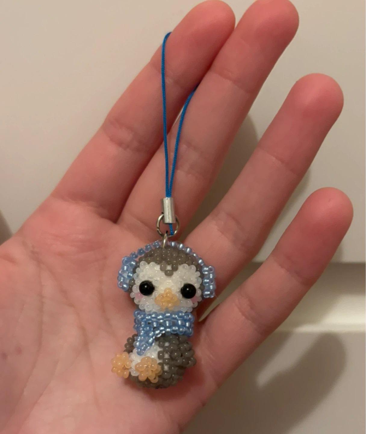 Check out this adorable handmade penguin charm! It's carefully crafted with tiny beads and features a cute little blue scarf. Perfect for adding a touch of whimsy to your phone, bag, or keys