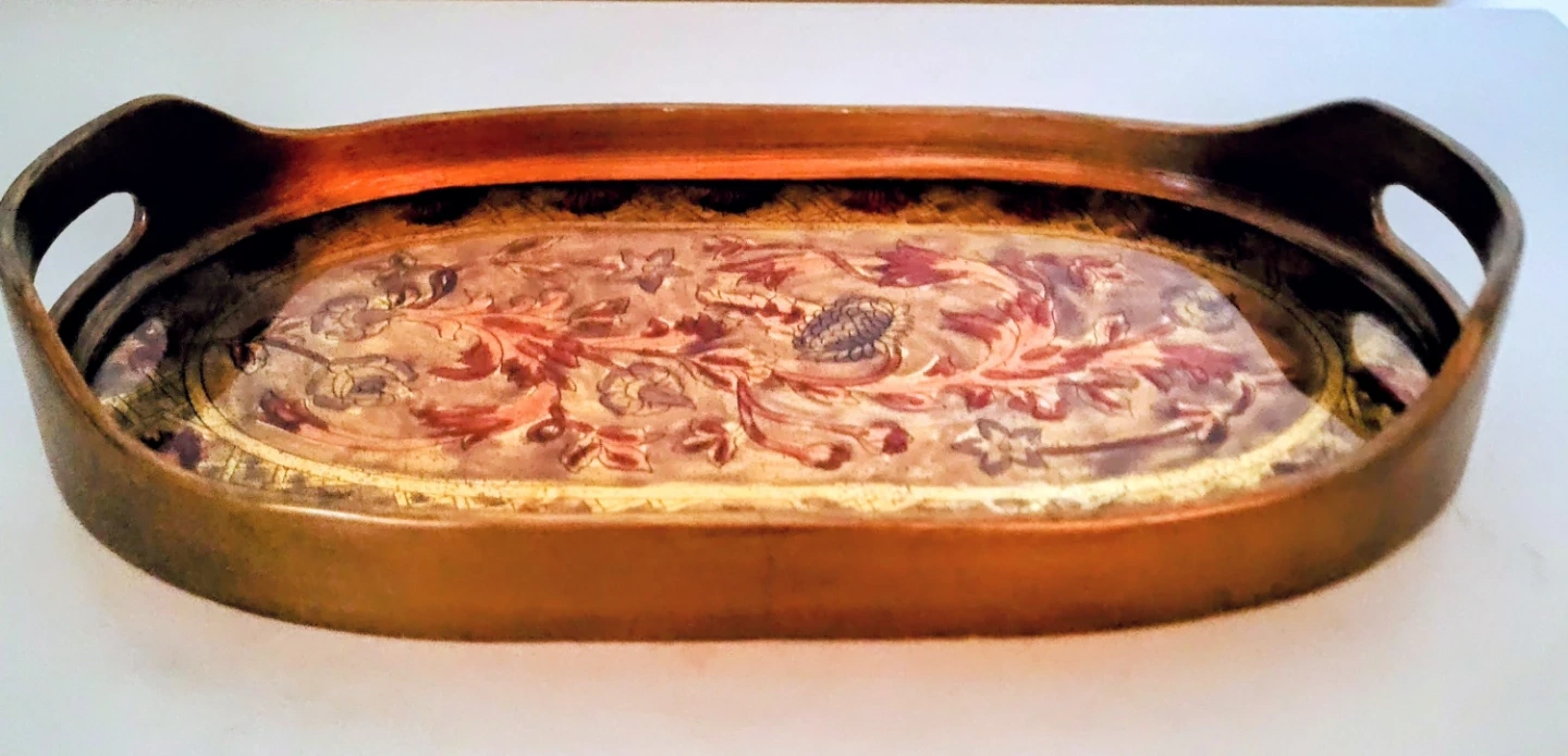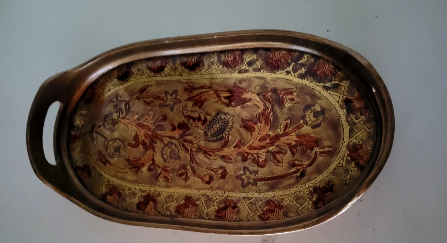 Selling a decorative oval serving tray. It has a beautiful floral design in shades of brown and gold. Perfect for serving or as a decorative piece in your home!