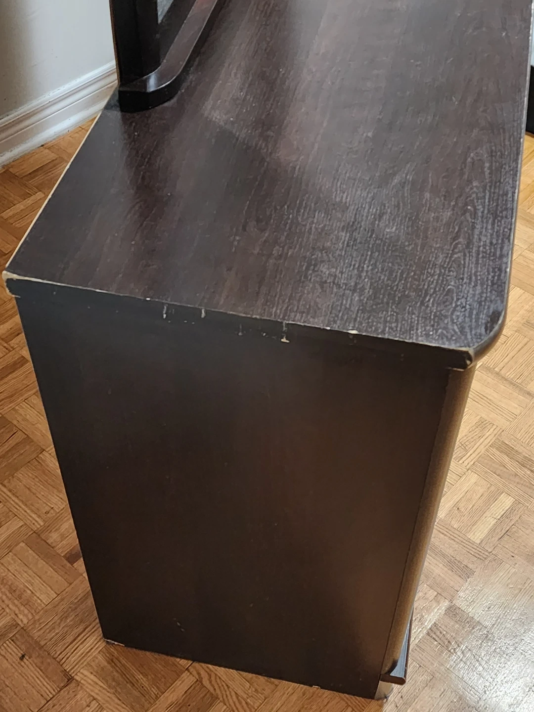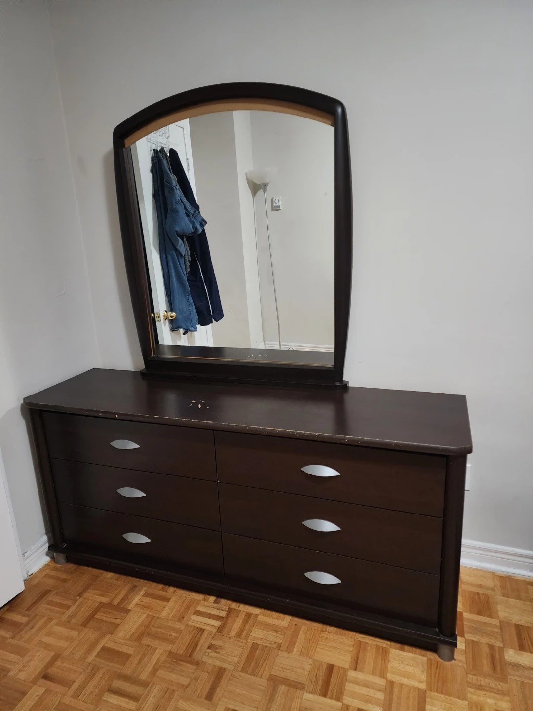 Dark brown dresser with a mirror. There are some scratches on the top surface and edges. Please see the photos for details! Move out Sale! Pick up requests only