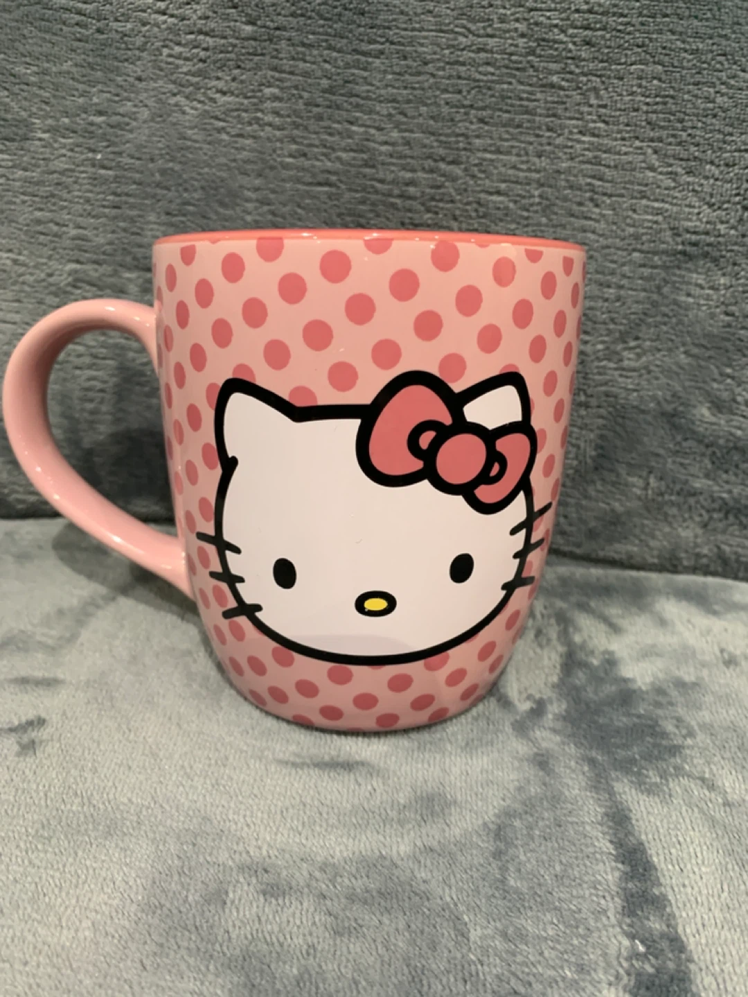 A cute Hello Kitty mug with a pink polka dot design! Perfect for any Hello Kitty fan, or to add a touch of kawaii to your morning coffee