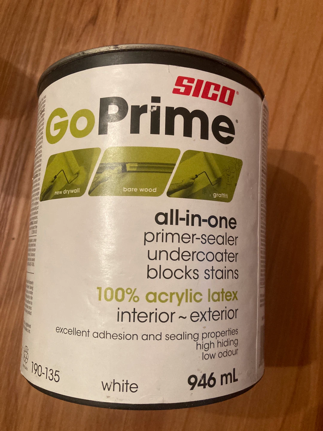 Selling a can of Sico GoPrime all-in-one primer-sealer. It's a 100% acrylic latex, suitable for both interior and exterior use. This white primer comes in a 946 mL can and offers excellent adhesion and sealing properties, with high hiding and low odour