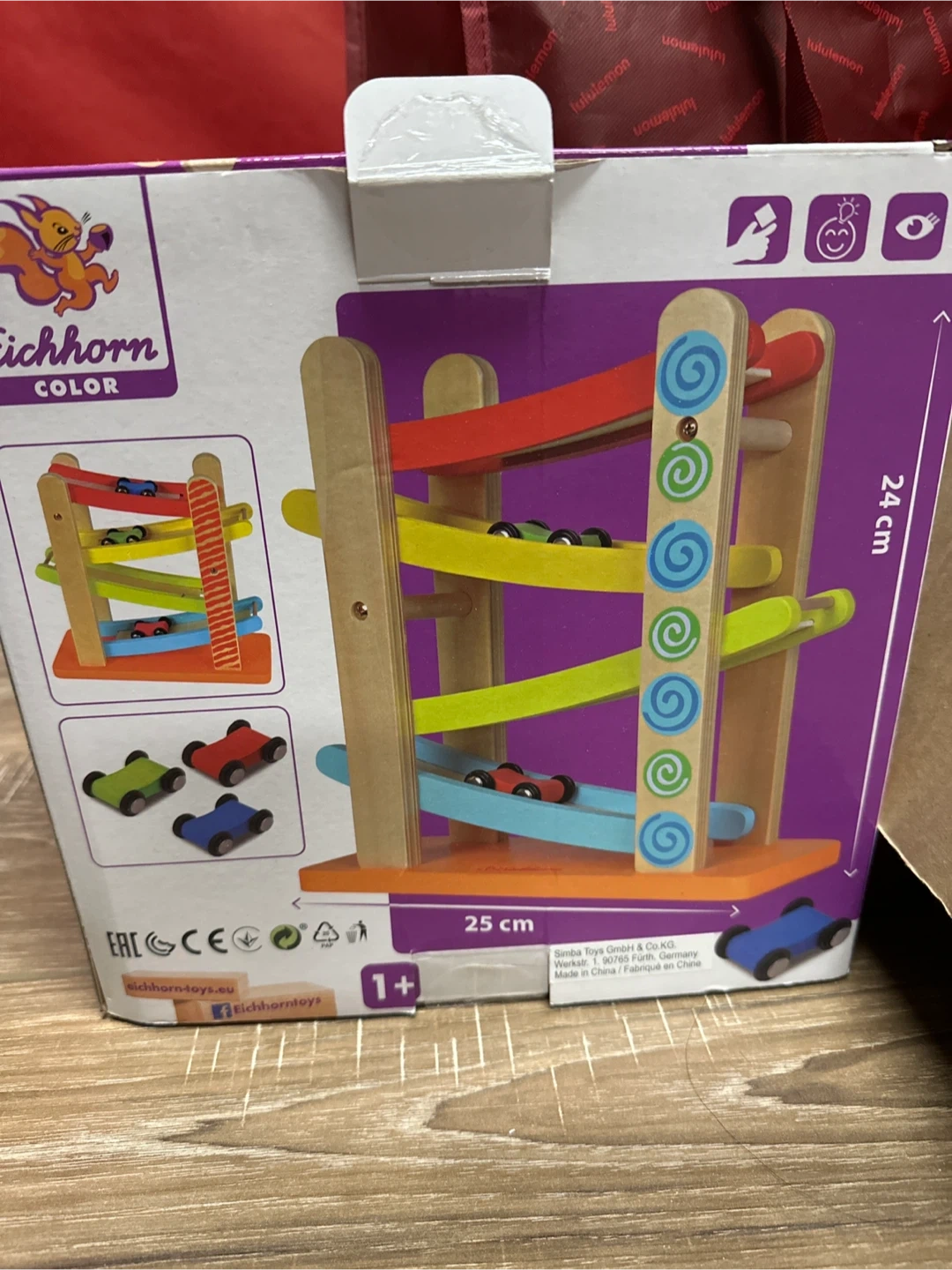 Selling a fun Eichhorn Colour wooden car track toy! The box shows it's suitable for ages 1+. The track is 24 cm high and 25 cm wide, perfect for little hands to enjoy. It’s in great condition and ready for a new home.
