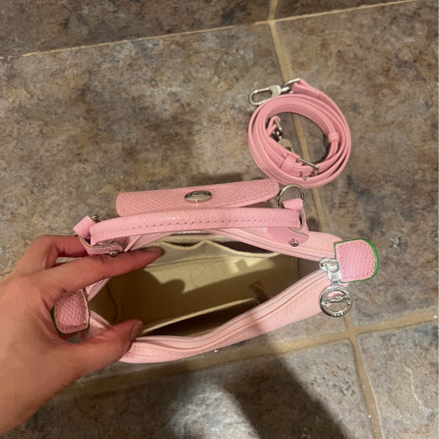 Comes with a detachable strap + organizer with two card slots and coin zipper.