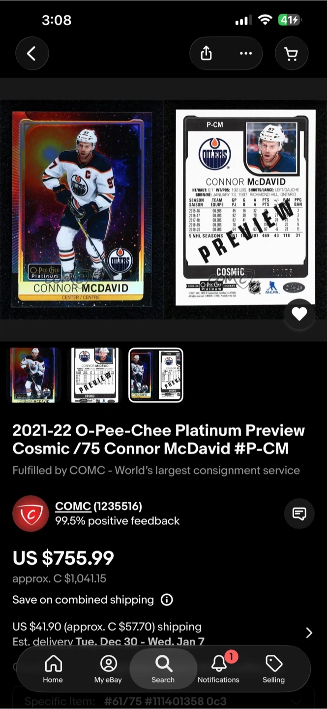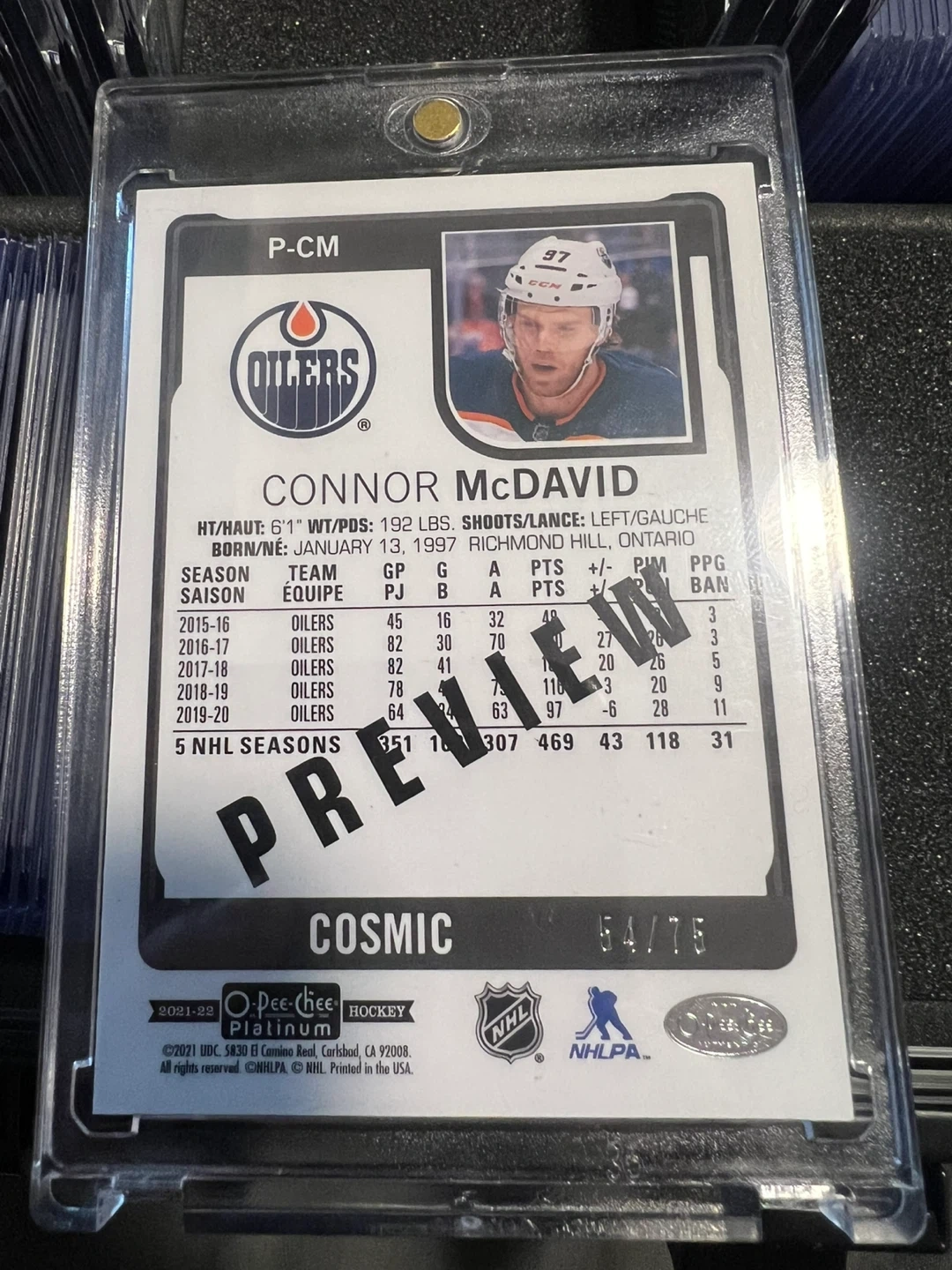Selling a Connor McDavid hockey card from the 2021-22 O-Pee-Chee Platinum. It’s a Cosmic Preview 54/75. It's in great condition and ready for a new collection! I’ve only ever seen 1 of these on the market! Very rare