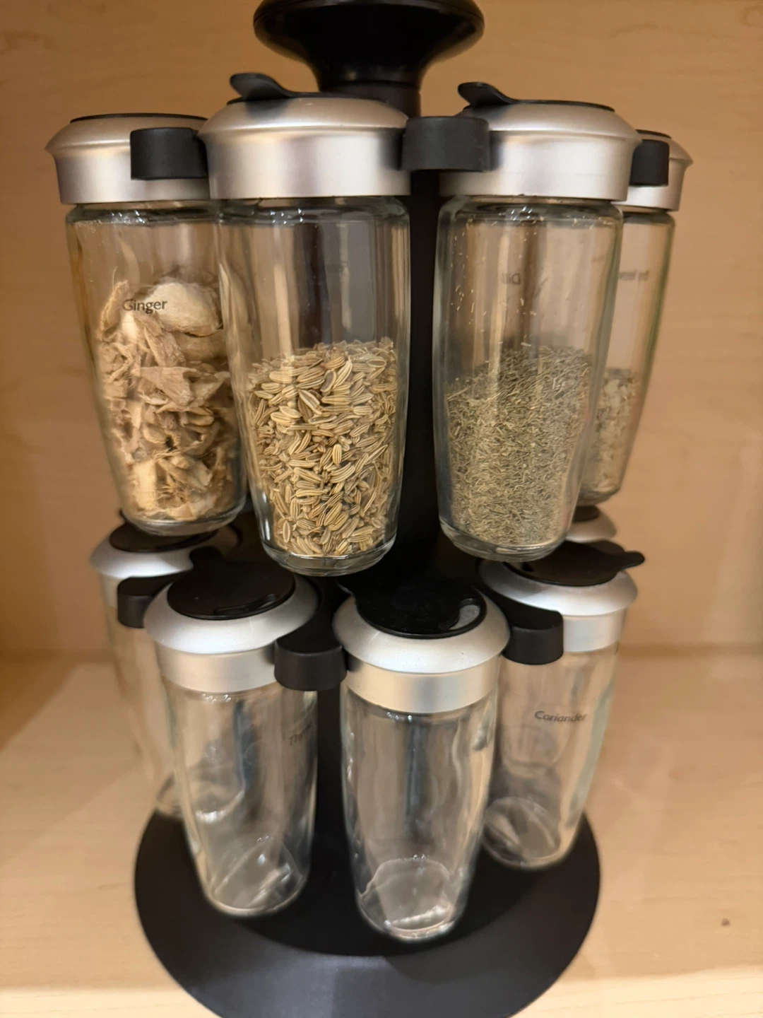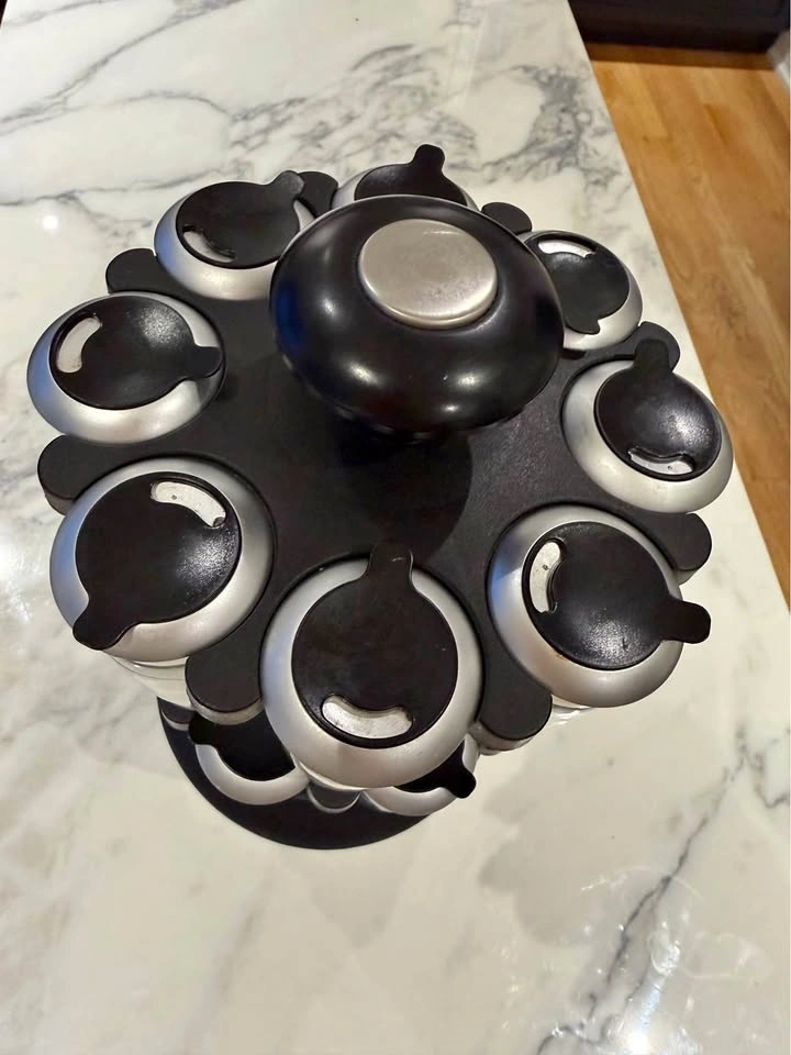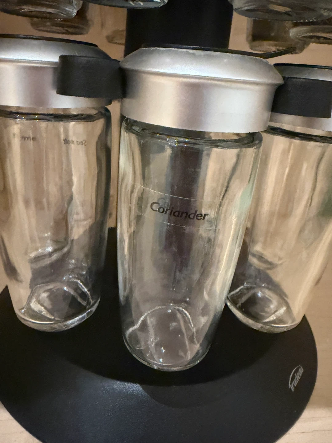 Rotating condiment tray, great display for your kitchen and very useful to reach for your spices. Comes as is. Comes with a few spices. All bottles already labelled. Never used. Got as gift
