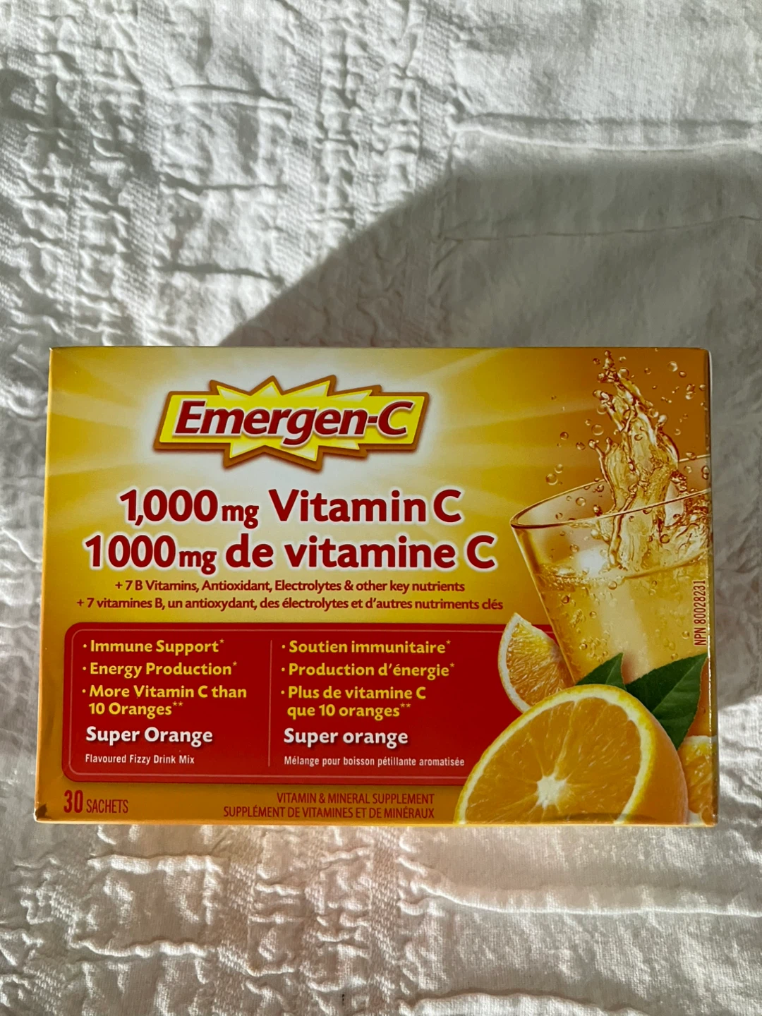 Selling a box of Emergen-C Vitamin C, Super Orange flavour! Each box contains 30 sachets, perfect for a little immune boost. It's a fizzy drink mix with 1000mg of Vitamin C, plus 7 B vitamins, antioxidants, and electrolytes