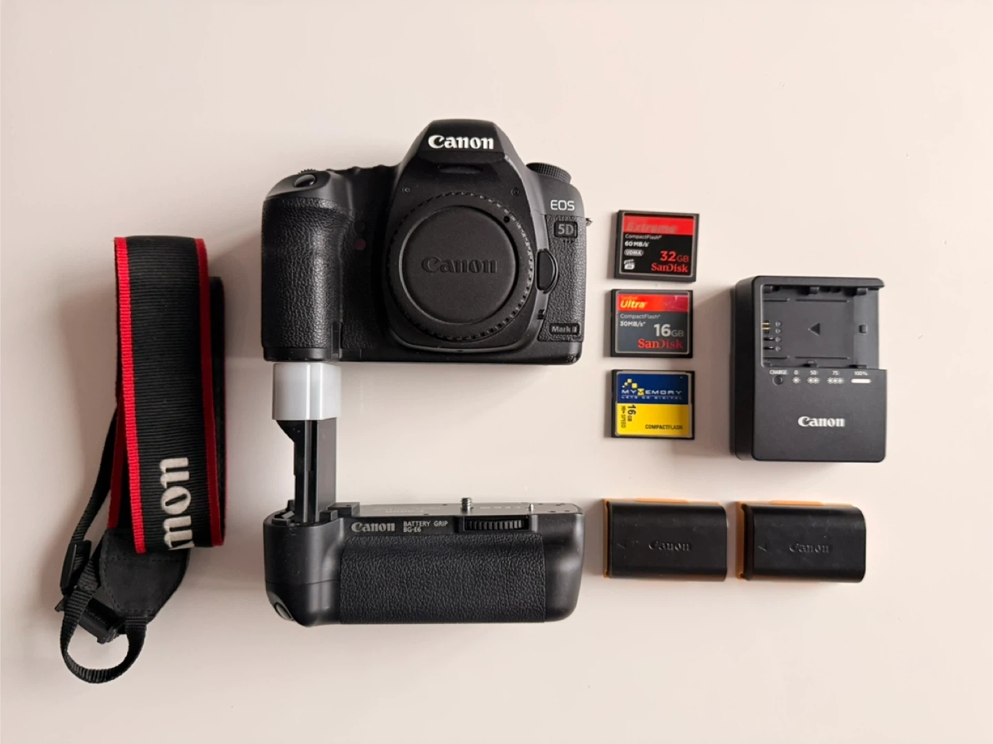 Selling a Canon EOS 5D Mark II digital camera. It comes with a battery grip BG-E6, oem charger and batteries (x2), Canon 7D strap, and 3 SD cards. I used this as a second shooter or backup, great camera to have.
