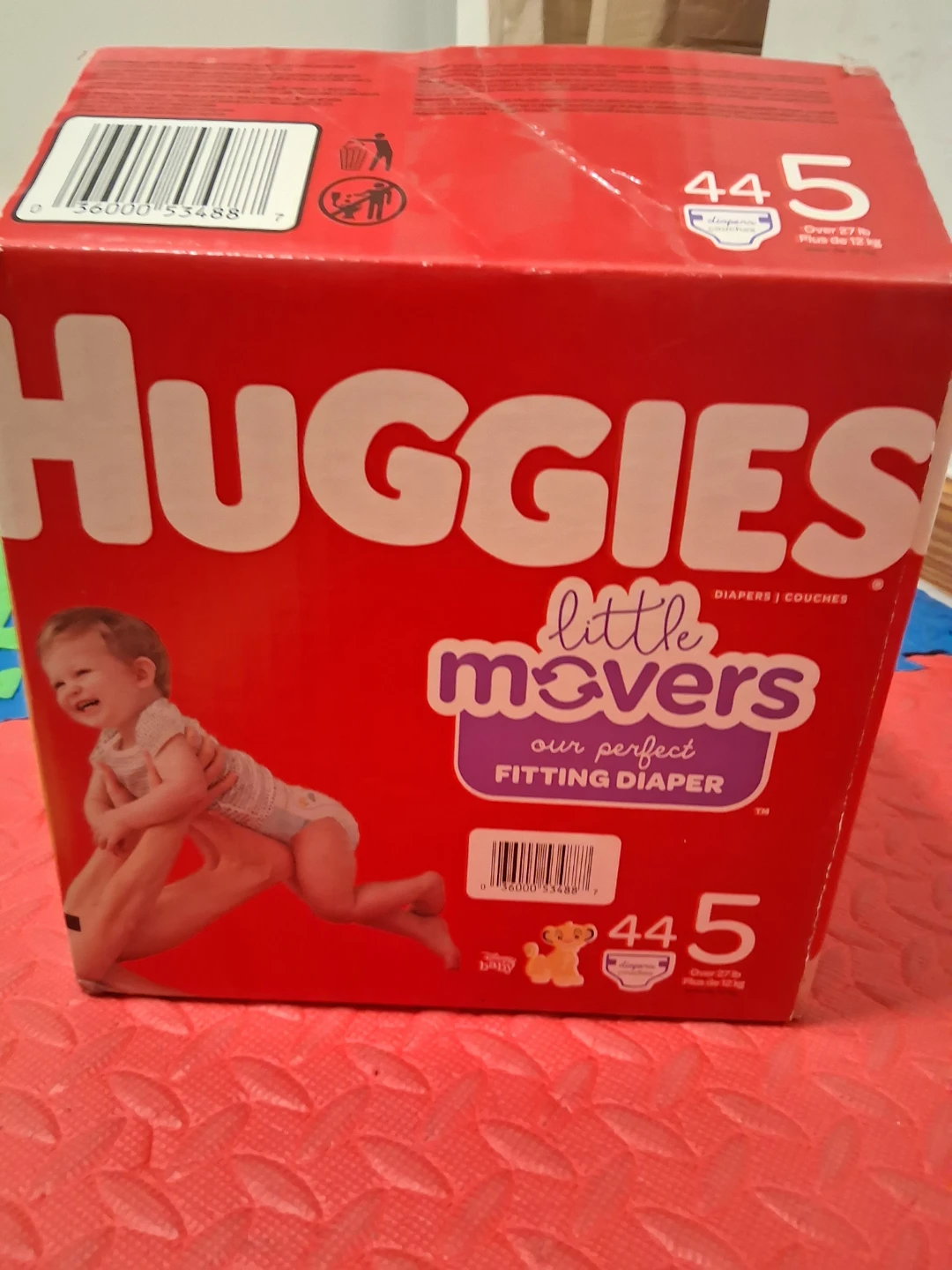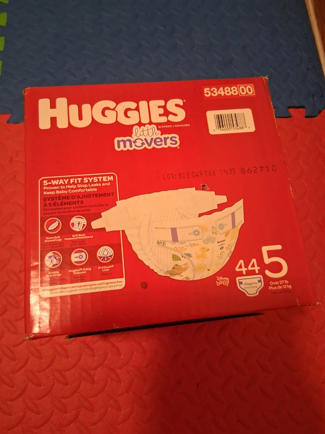 Selling a box of Huggies Little Movers diapers, size 5. The box contains 44 diapers. These diapers are designed with a 5-way fit system to help stop leaks and keep your baby comfortable. They are hypoallergenic and fragrance-free, perfect for sensitive skin.
