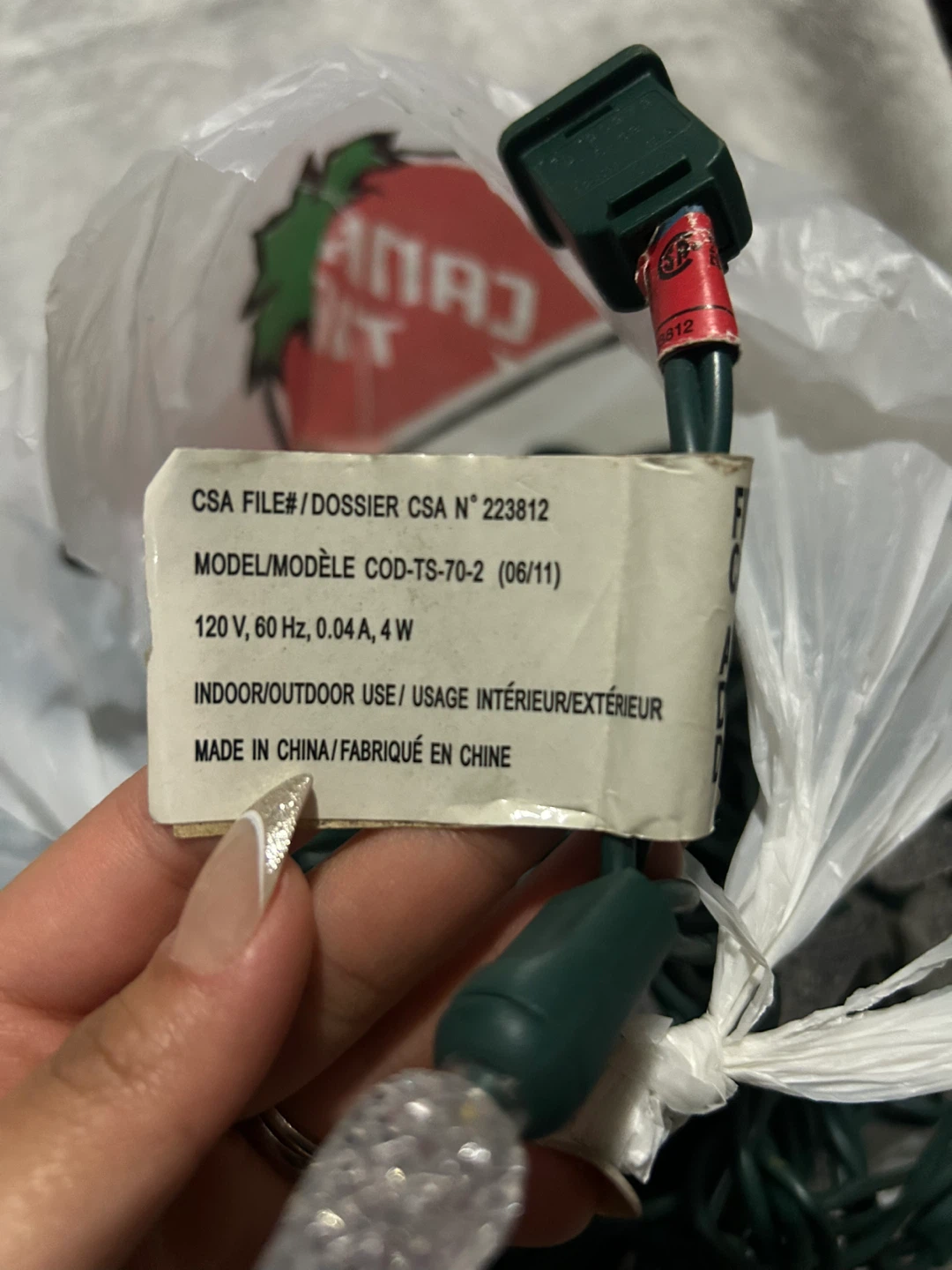 Selling a set of Christmas lights suitable for both indoor and outdoor use. These lights are 120 V, 60 Hz, 0.04 A, and 4 W. Model number COD-TS-70-2 (06/11)