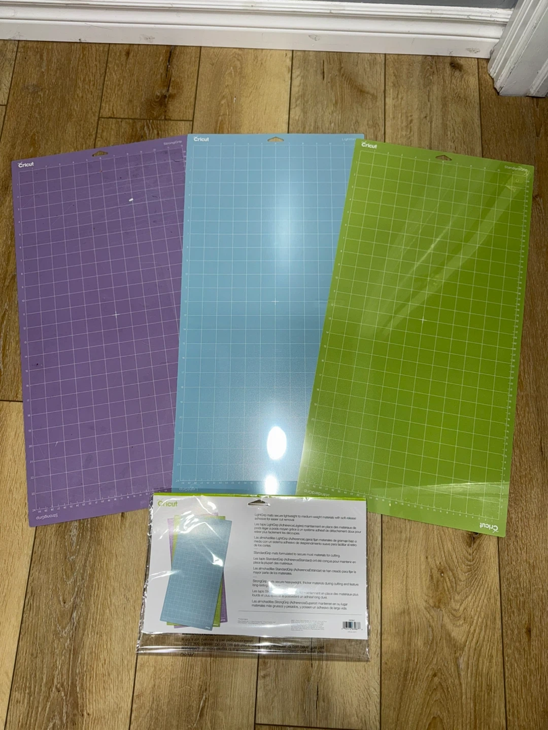 Cricut grip mats 12” x 24”. The green standard grip mat and blue light grip mat are brand new and the purple strong grip is used and has a cut in one corner (see pictures)