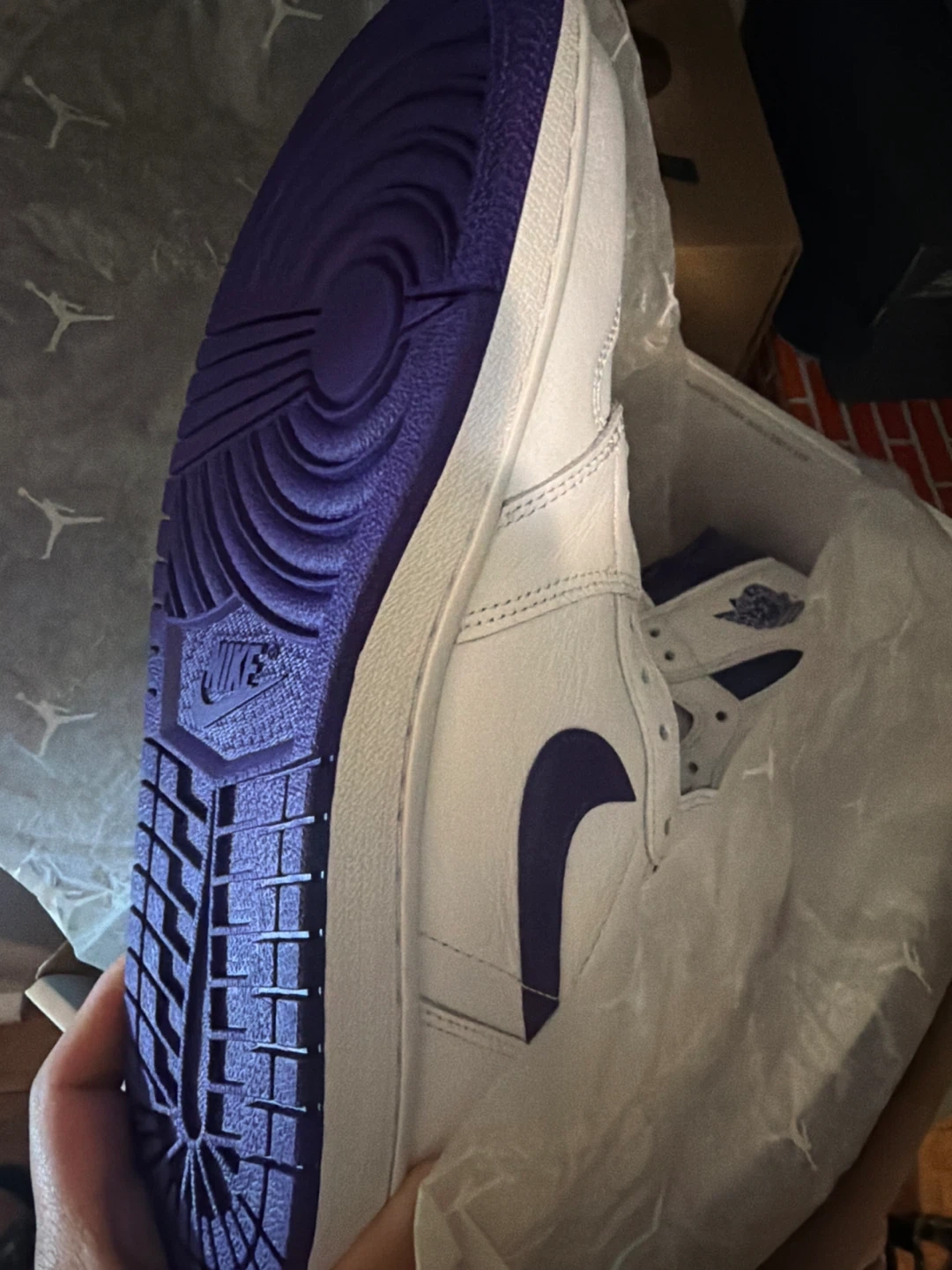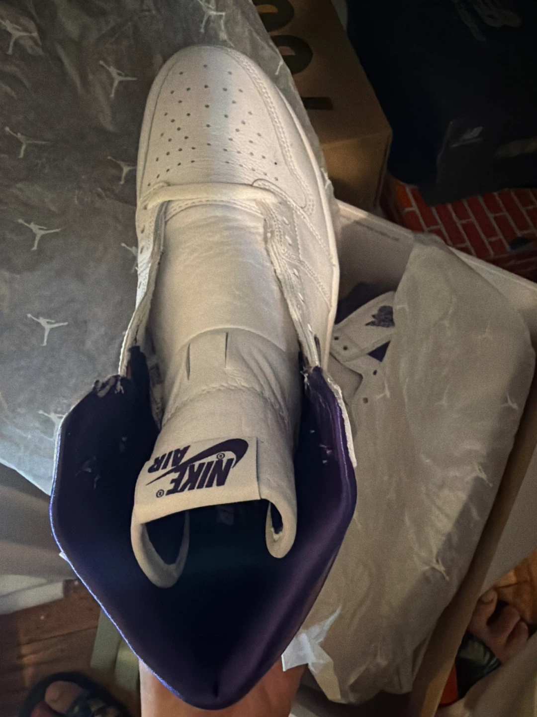 Selling a pair of Air Jordan 1 Retro High sneakers in White/Court Purple! They come with the original box. These shoes are in great condition and ready for a new owner