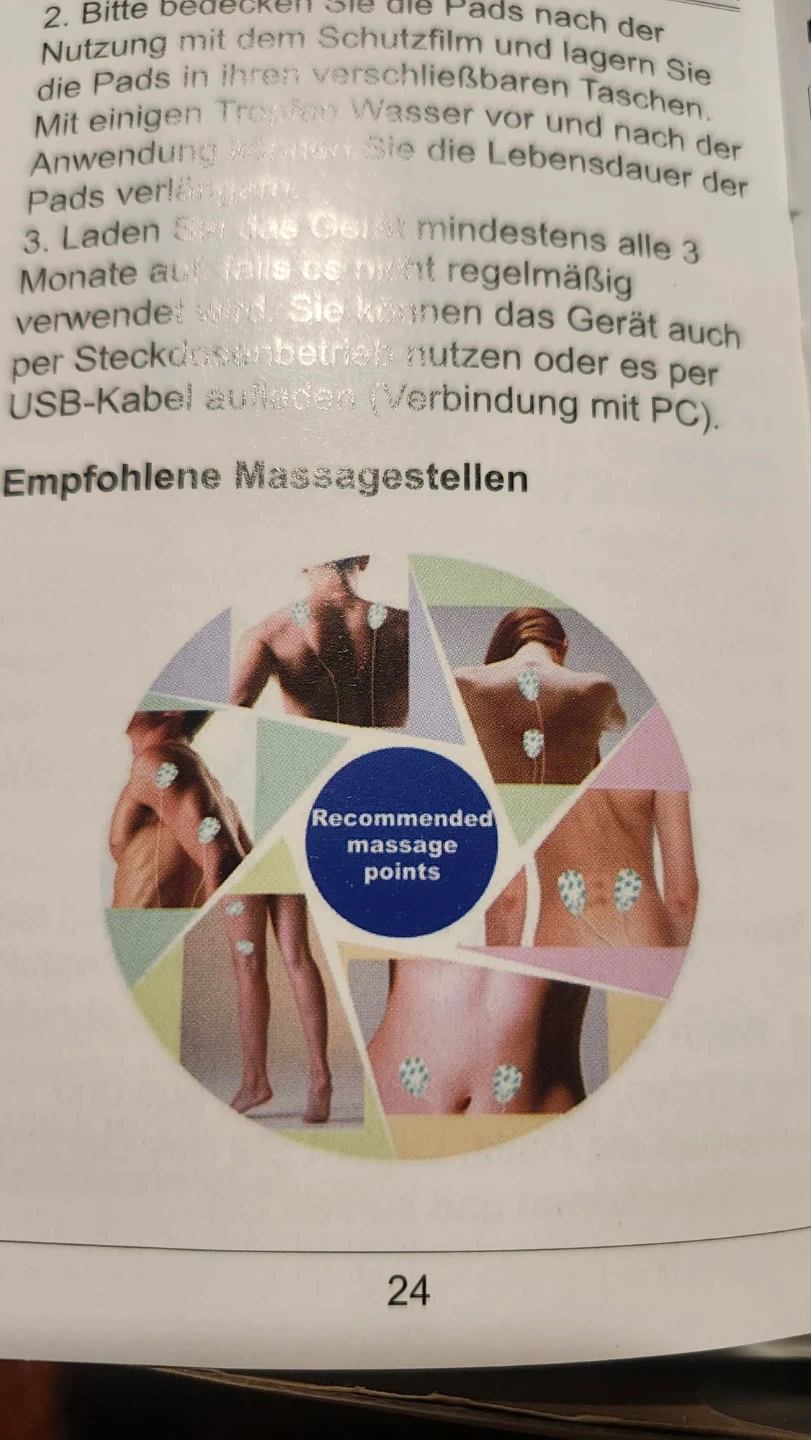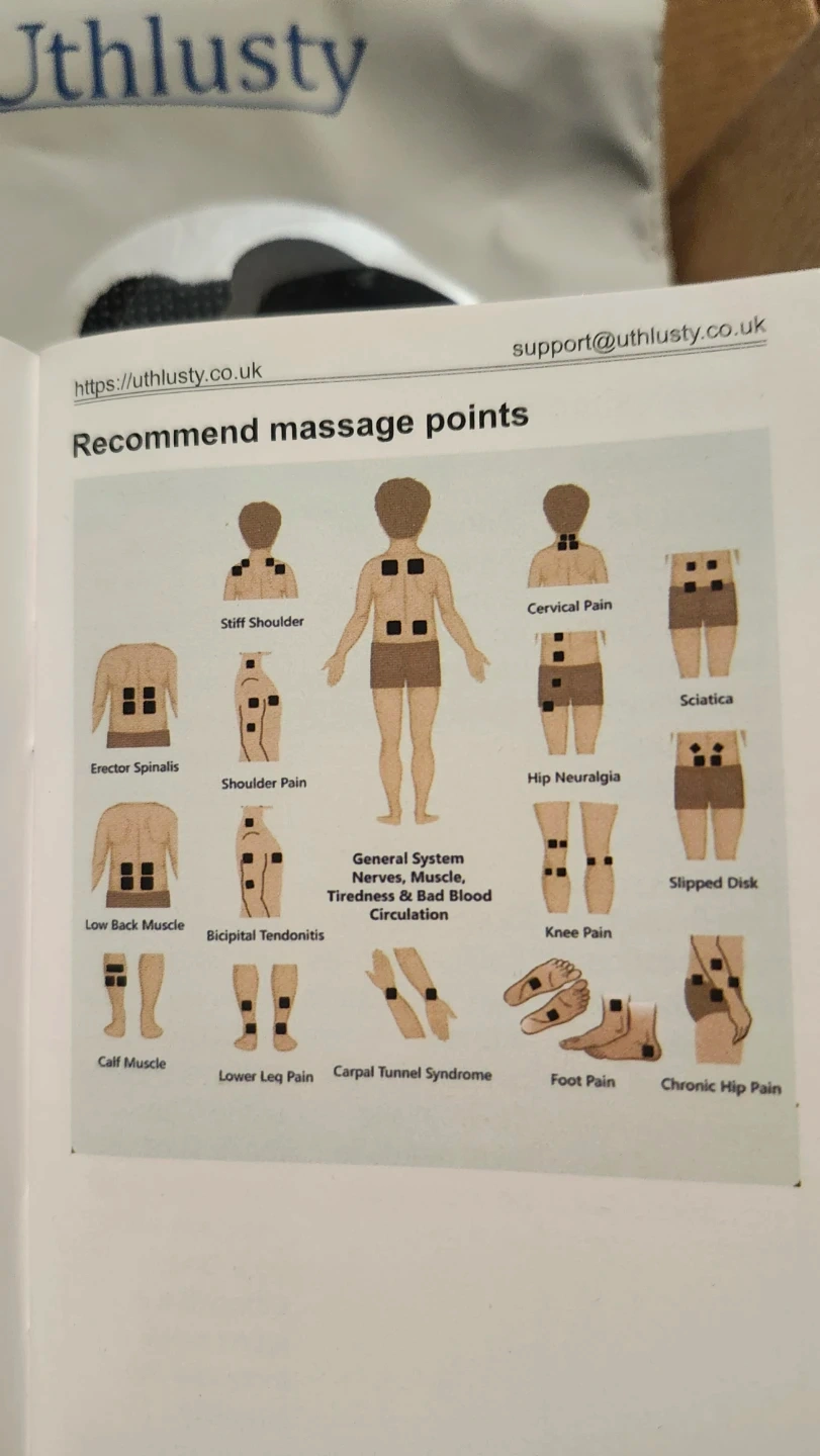 It comes with the box and all included components. This device is designed to provide pain relief and muscle stimulation. Check out the recommended massage points in the pictures!