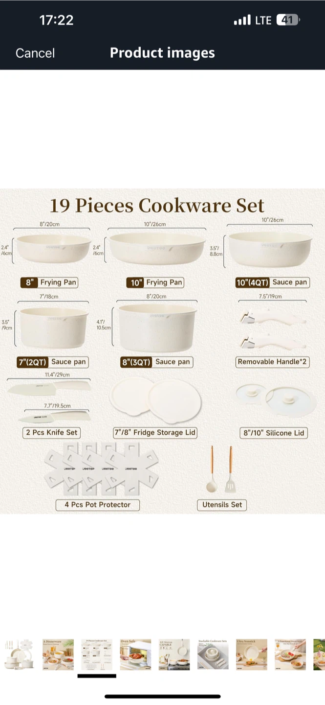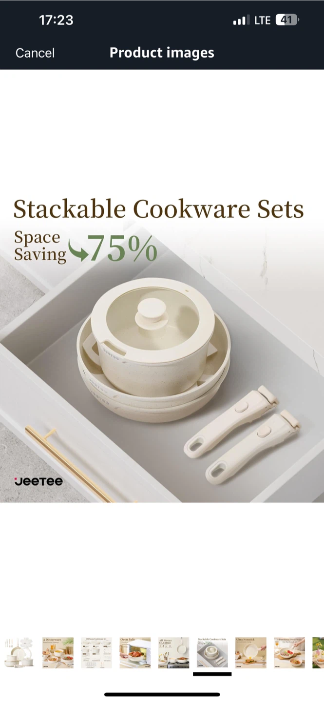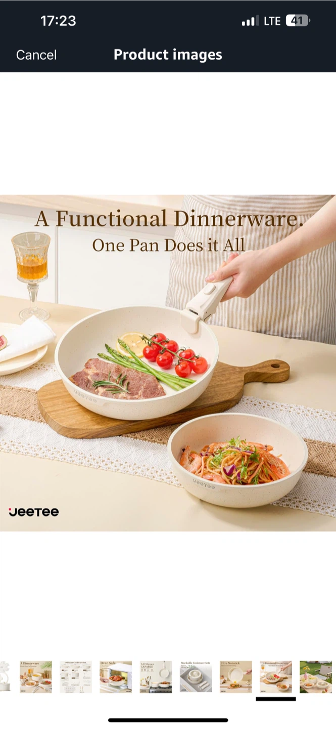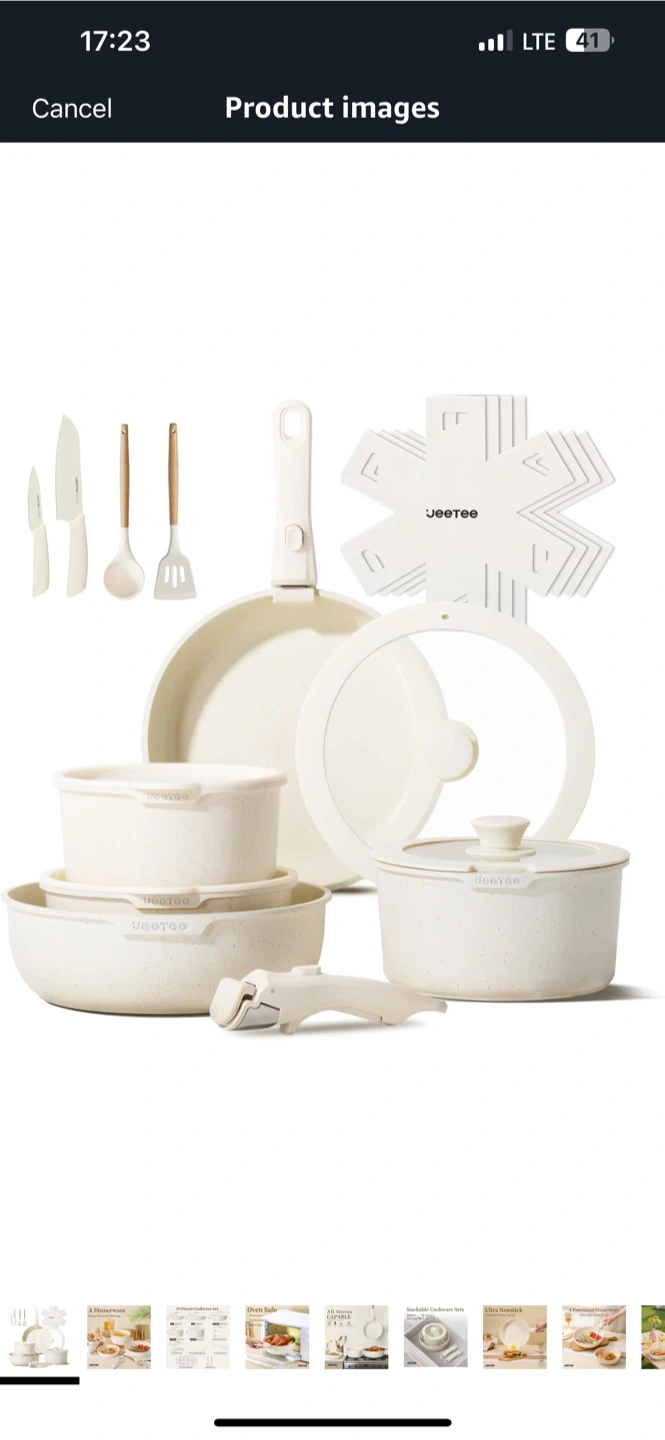 I’m selling a brand new Jeetee 19-piece cookware set! This stackable set is designed to save space and includes everything you may need for a functional dinnerware experience. It features oven-safe pans and pots. The set includes: