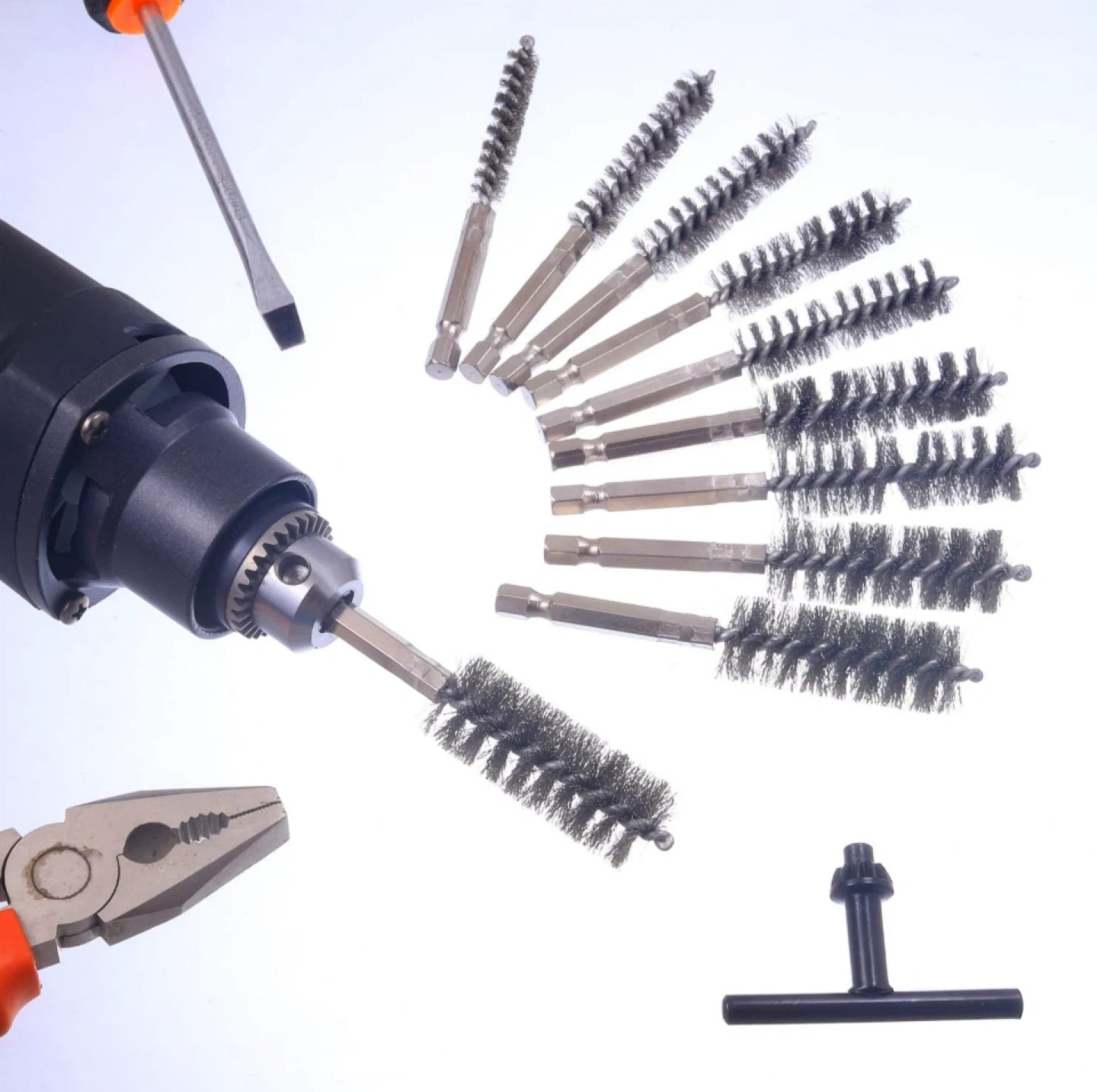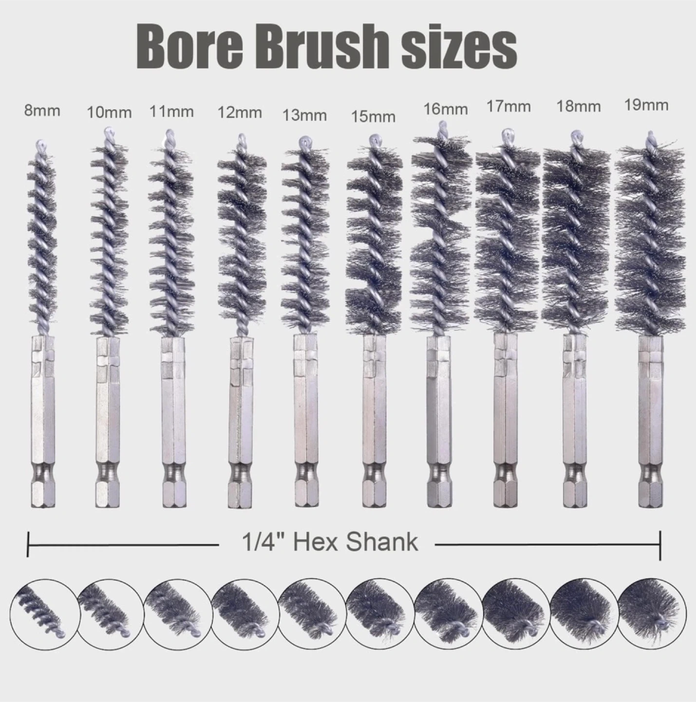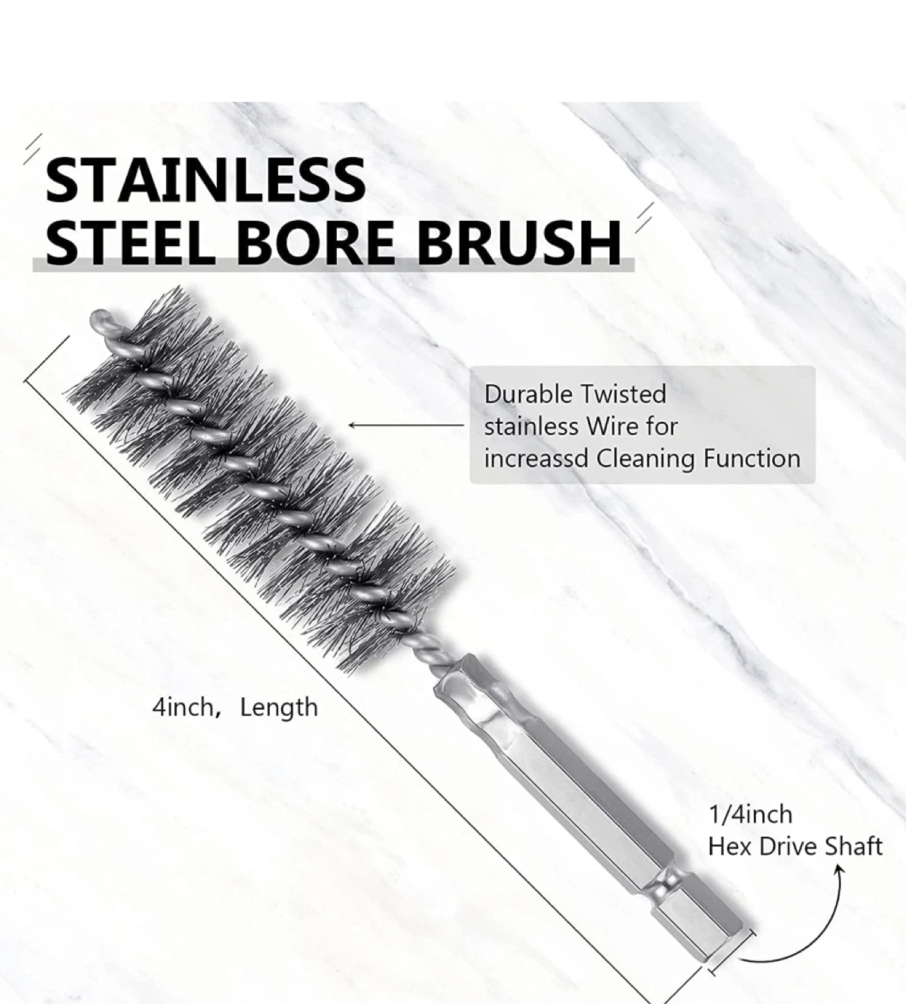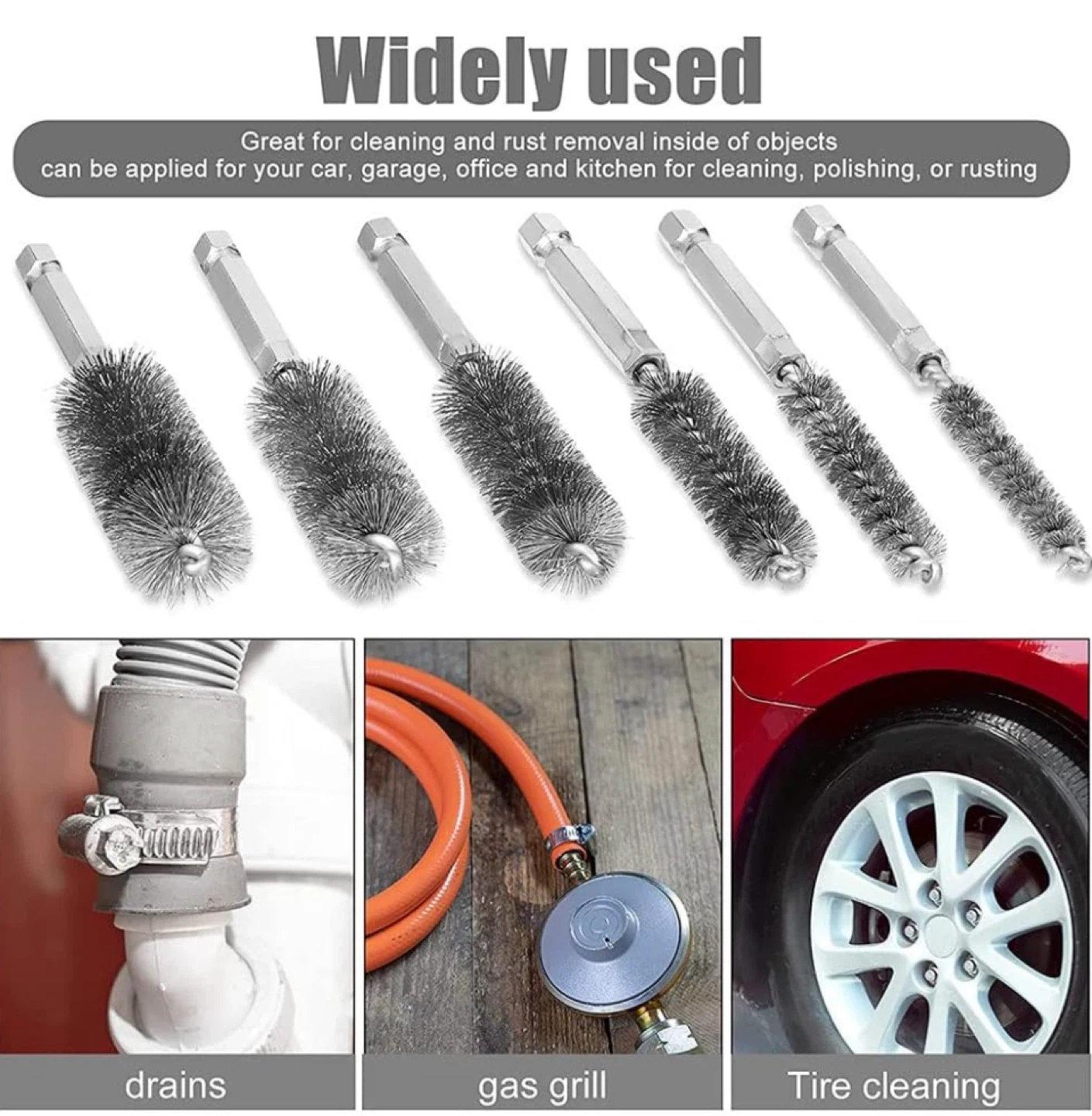 This is a set of stainless steel bore brushes, perfect for cleaning and rust removal. They're great for your car, garage, office, and kitchen. The brushes have a durable twisted stainless wire for increased cleaning function and a 1/4 inch hex drive shaft. They can be used for cleaning, polishing, or removing rust from inside objects like drains, gas grills, and tires
