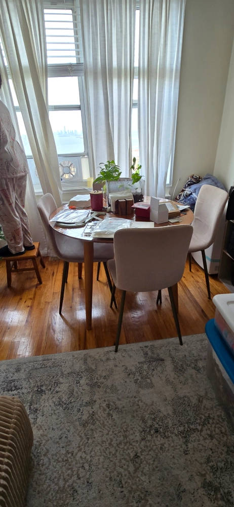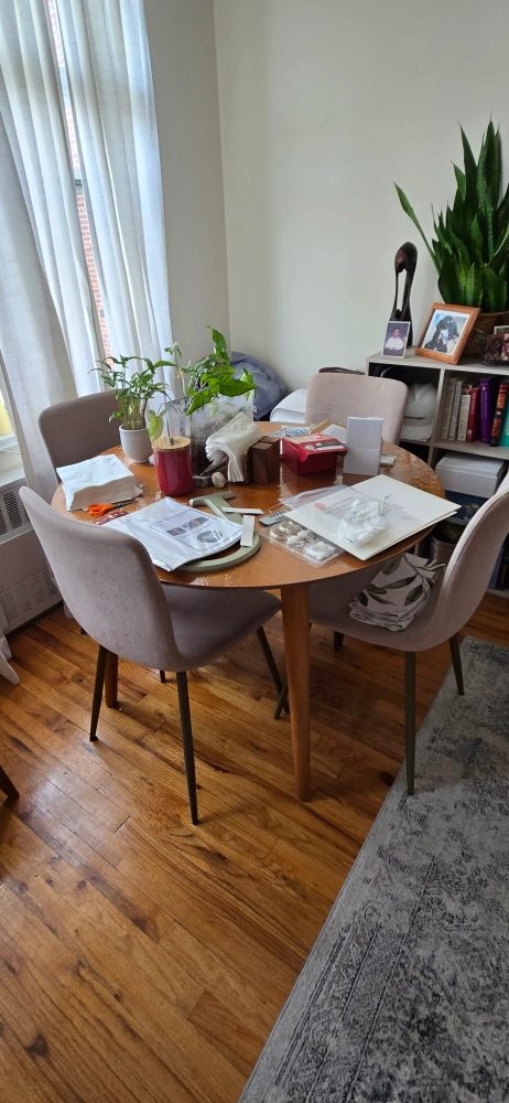 Selling a dining table with a small scratch that comes with four chairs. The table is round, seats 4, and perfect for a smaller dining area.