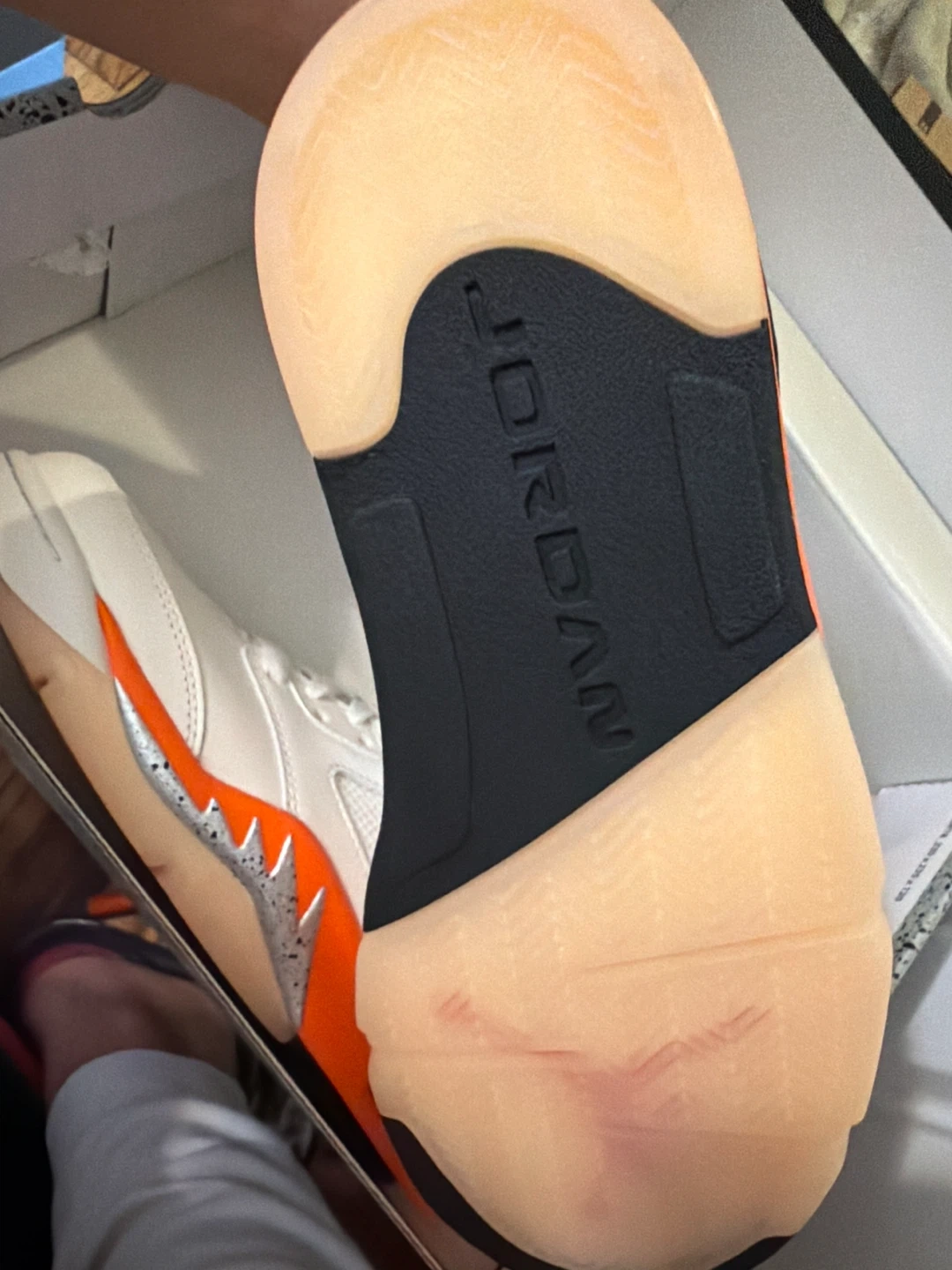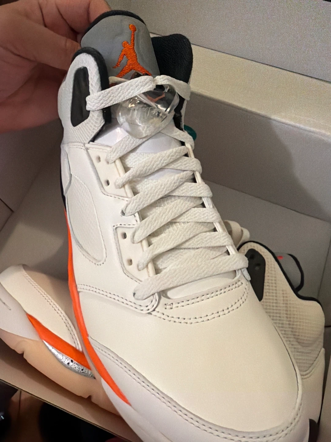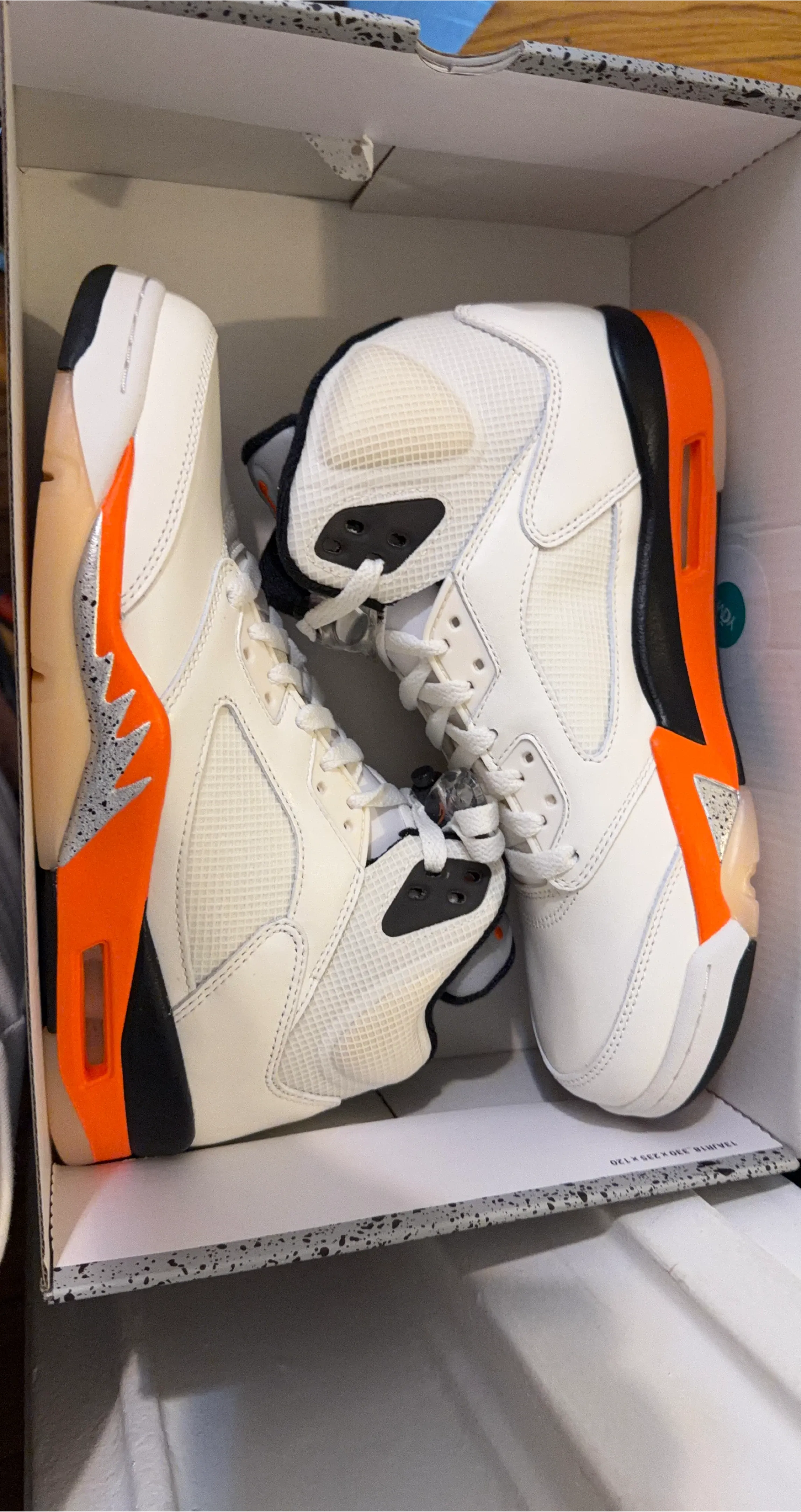 Selling a pair of Jordan 5 Retro SE sneakers. They come with the original box. The shoes are white with orange accents. Check out the photos for details!