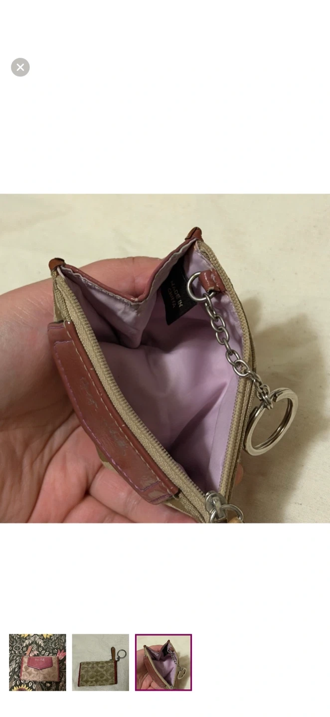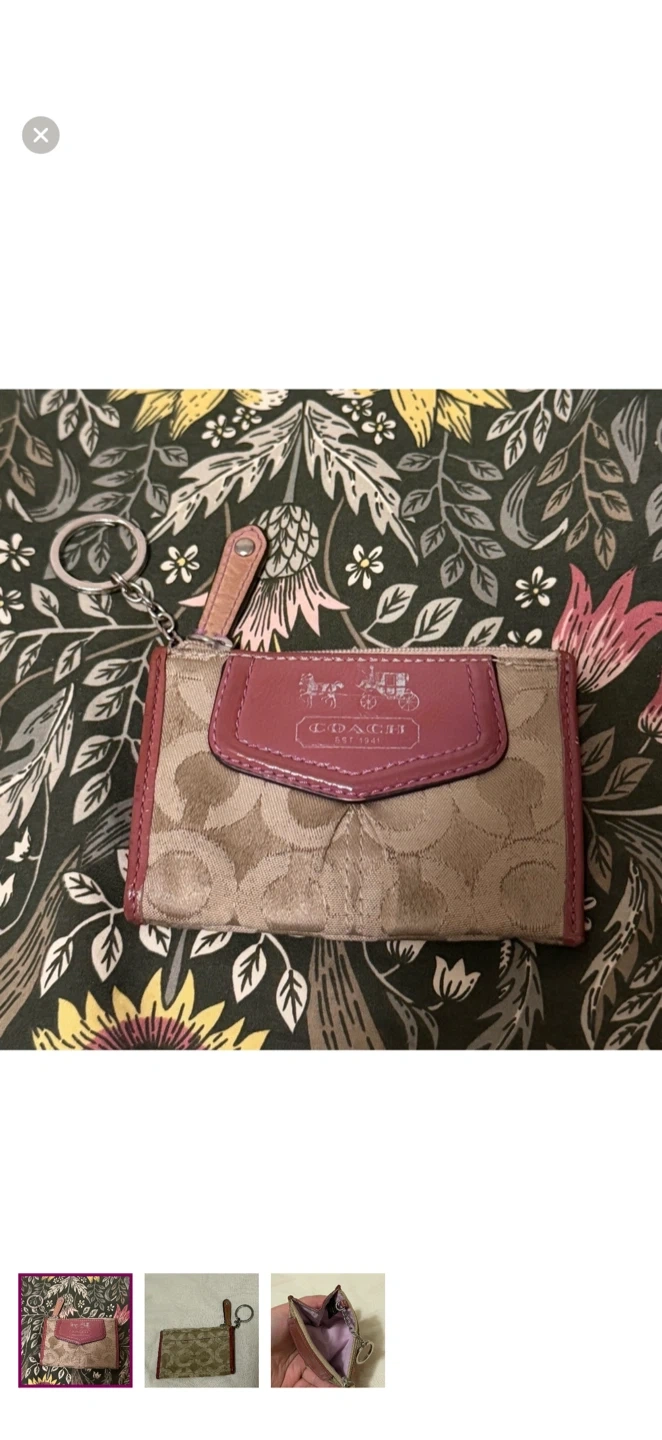 Elegant Coach card holder. Features signature pattern and pink leather trim. Includes keychain for convenience.
