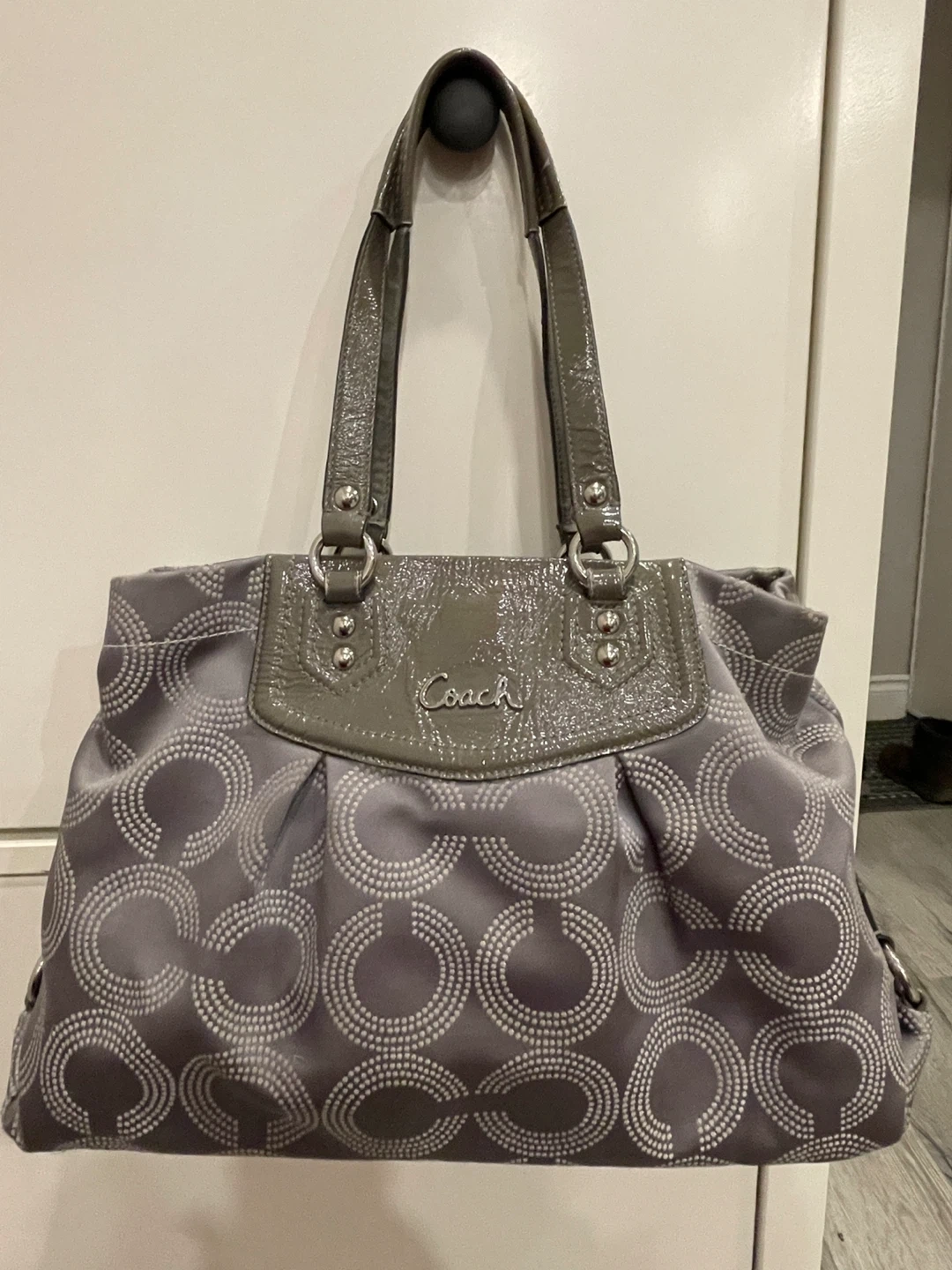 Selling a beautiful gray mix of canvas and leather with a signature c pattern. Dimensions: 15" x 10" x 3"Handle Drop: 9"