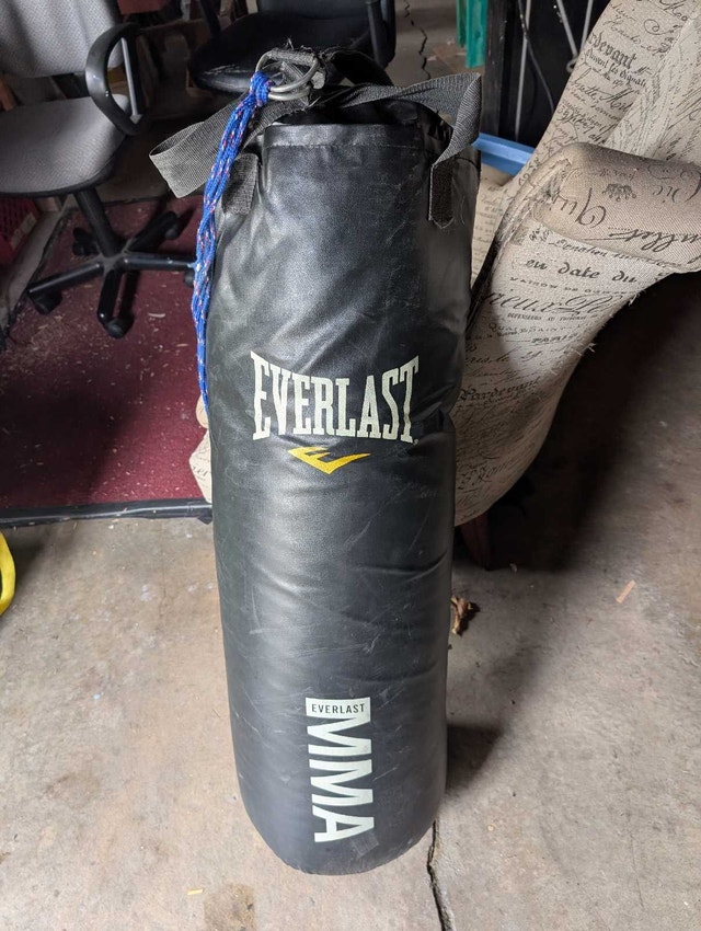 Get ready to rumble with this Everlast MMA punching bag and glove set! This is a great set for someone looking to start training in martial arts. The bag is in used condition with some signs of wear, but still has a lot of fight left in it. The gloves are also used, but in good shape and ready for action. No chain or hanging device used rope and hung it from my tree out back but got no use for it anymore. PICKUP ONLY. TEXT OR MESSAGE ON HERE. Specifications: * Brand: Everlast * Sport/Activity: MMA * Bag Type: Heavy/Hanging Bag * Glove Size: Regular Looking to add a little punch to your fitness routine? Look no further! This Everlast MMA set is just the ticket. Please note that if the ad is still posted, the item is available, so get ready to unleash your inner warrior!